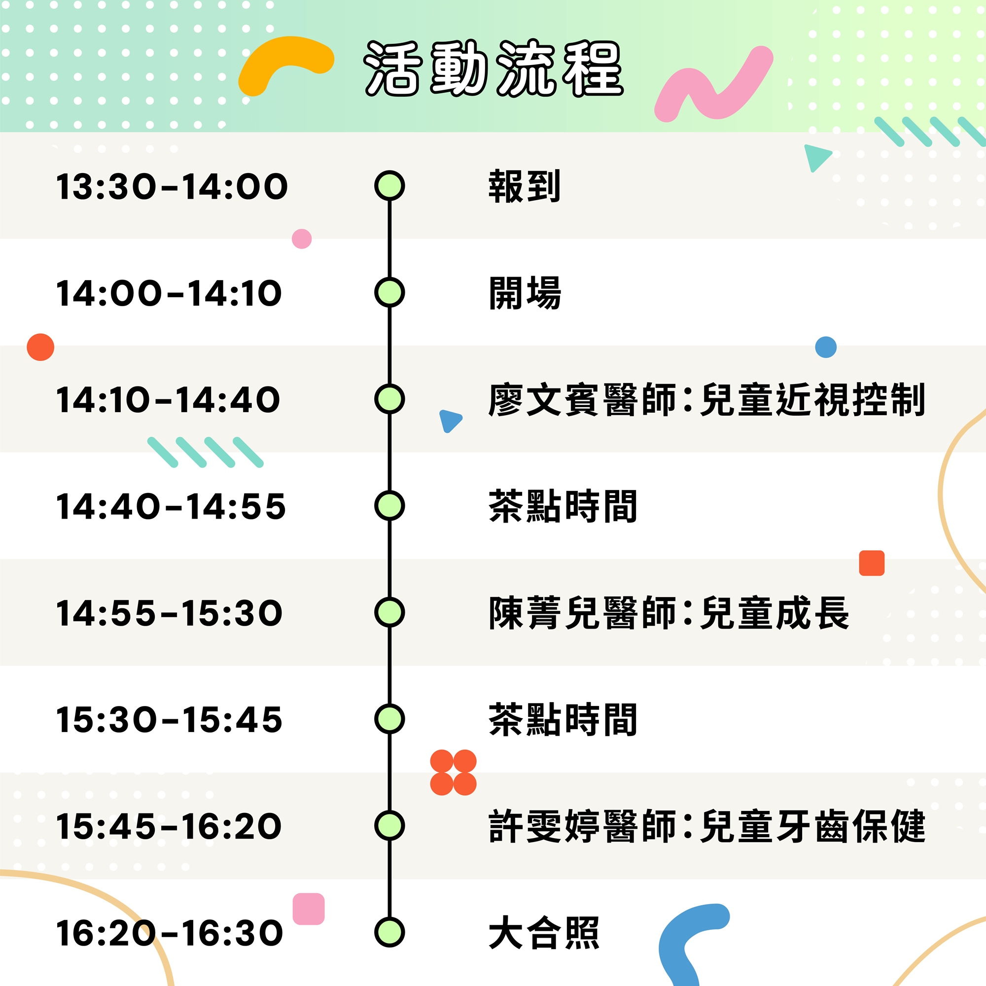 邀請眼科 廖文賓醫師、兒科 陳菁兒醫師、牙科 許雯婷醫師擔任講師,一同探討兒童成長議題!現場備有茶點與神秘小禮物,歡迎家長帶小朋友參加!(為維護學習品質,一名大人最多帶一名小朋友,兩名孩子則兩位家長,以此類推。)