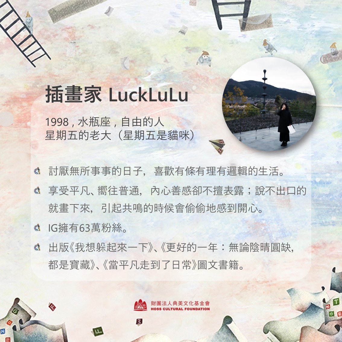 擁有63萬粉絲的IG人氣插畫家 LuckyLuLu 將以自身經歷與我們分享如何精進技能、穩定風格特色與創作路上的甘苦大小事。同時,也將解密她在社群經營及作品出版的寶貴經驗。