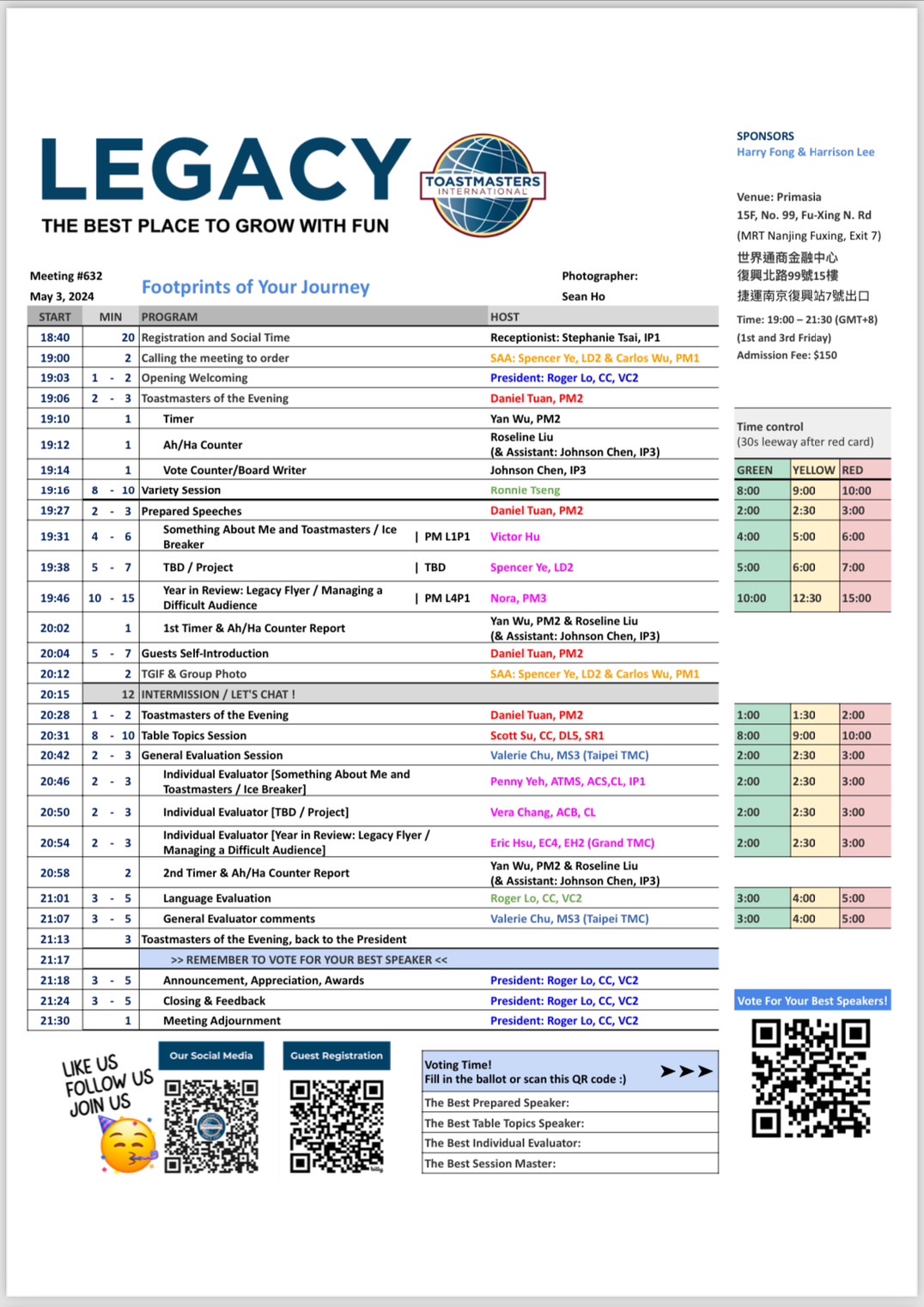 Legacy Toastmasters is a group of passionate and professional people. We gather to practice public speaking skills in English, and learn from each other, and share the good time together.