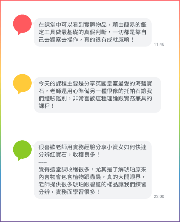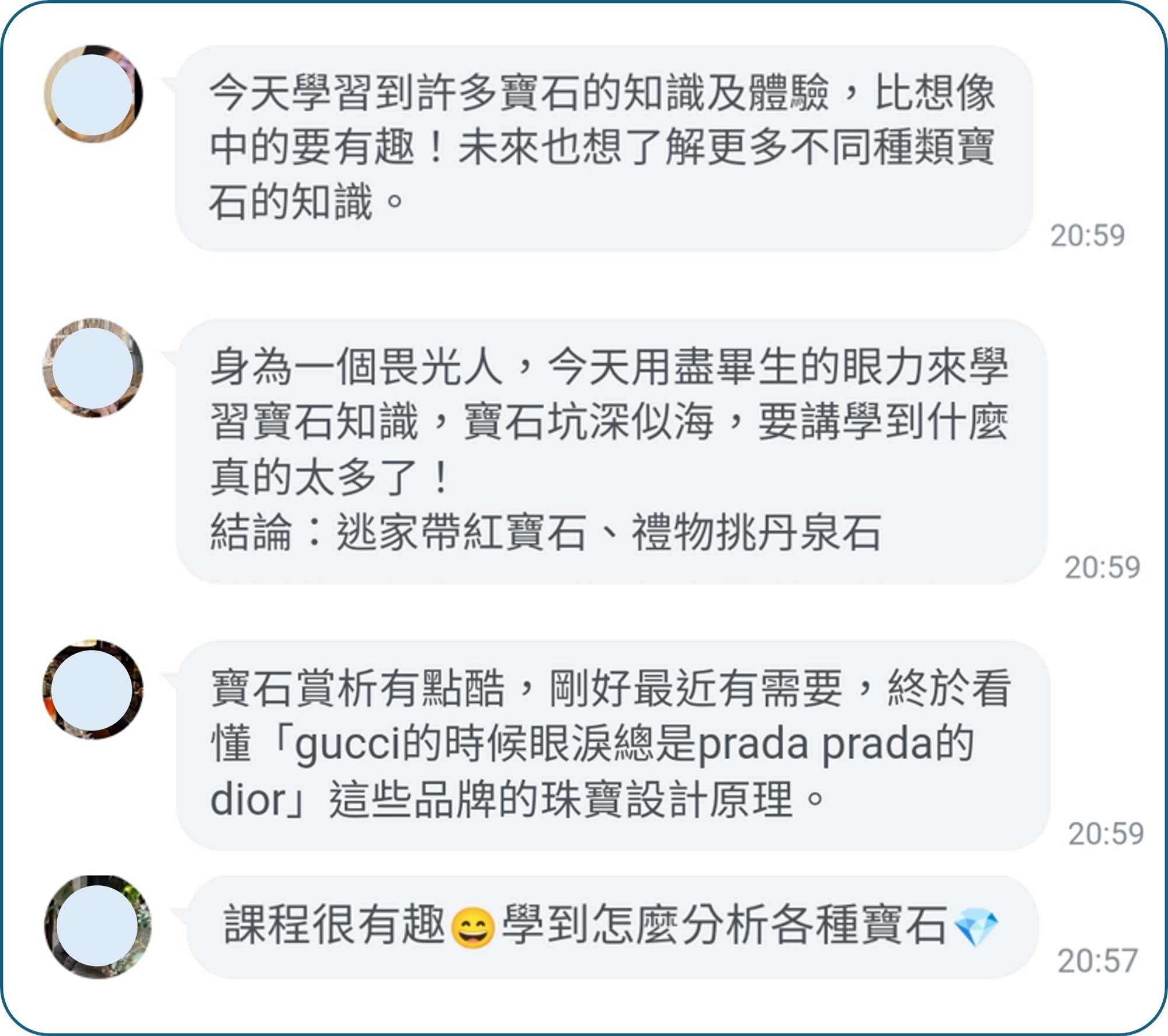 - 主講人擁有美國IGS各式彩色寶石專家認證標章與通過美國GIA彩色寶石價值分級認證。