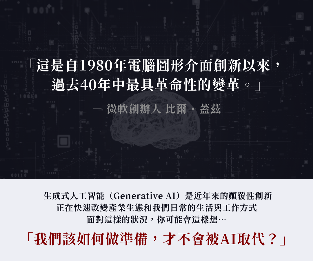 微軟創辦人 比爾·蓋茲曾提到「在未來的5到10年內,每個人將擁有自己的AI助理。」,AI技術與新工具的出現是為了幫助我們更高效地完成工作,而不是取代我們。盡早學習與AI協作的技巧,將增強個人的競爭力,就能在快速發展的職場環境中更具優勢。