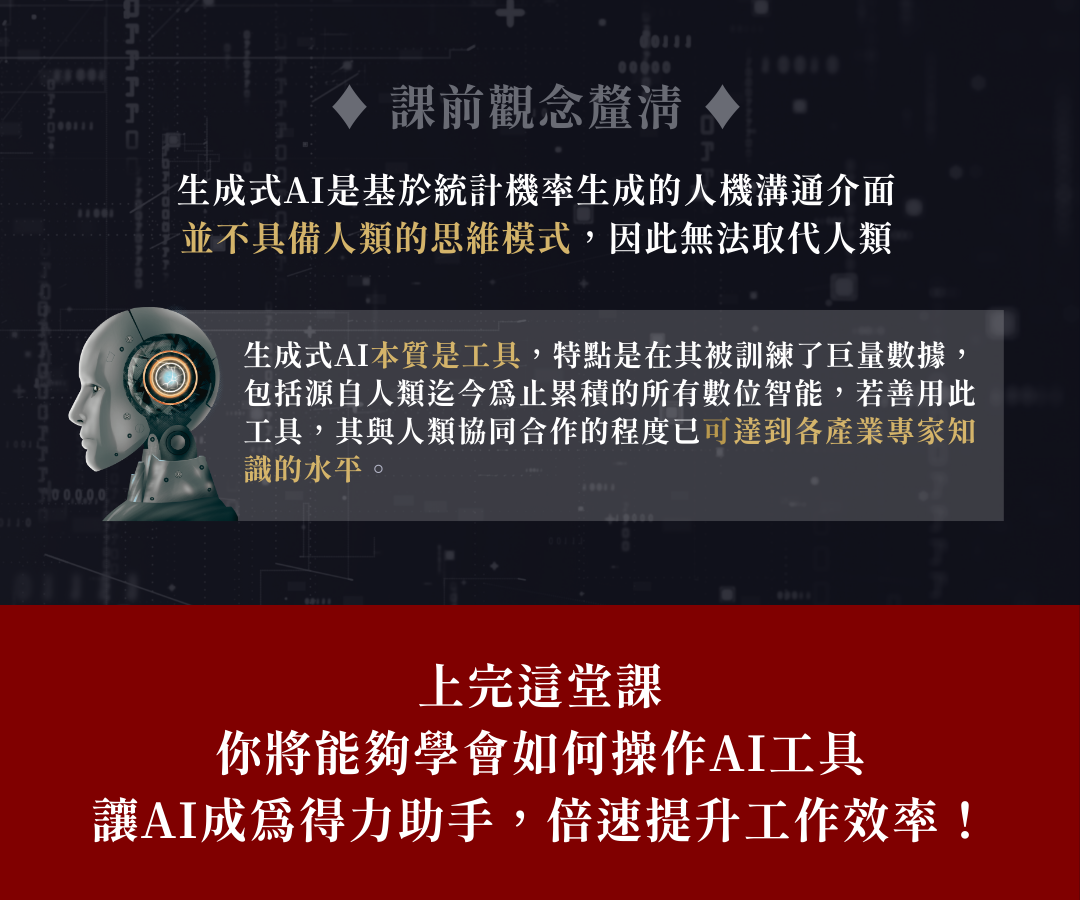 本堂課將帶領你認識「生成式AI」,並透過人類獨特的「邏輯思維」模式,掌握與AI協作的關鍵技巧,進而倍速提高生產力、優化工作效能。