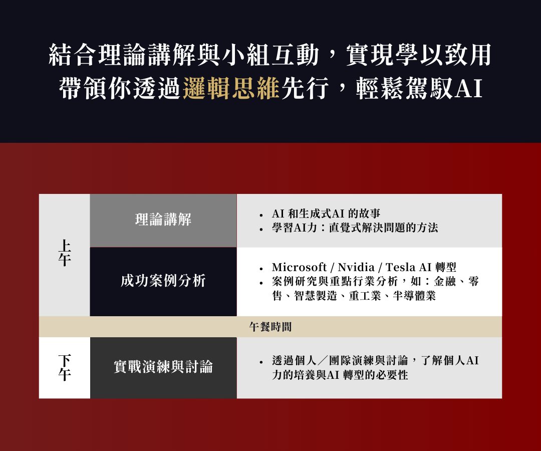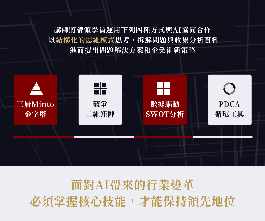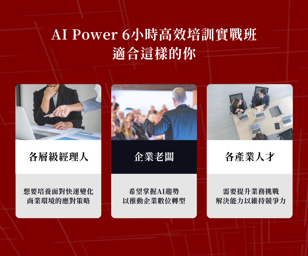 - 學習透過AI技術,促進創新思維和優化問題解決方案,提升商業決策品質