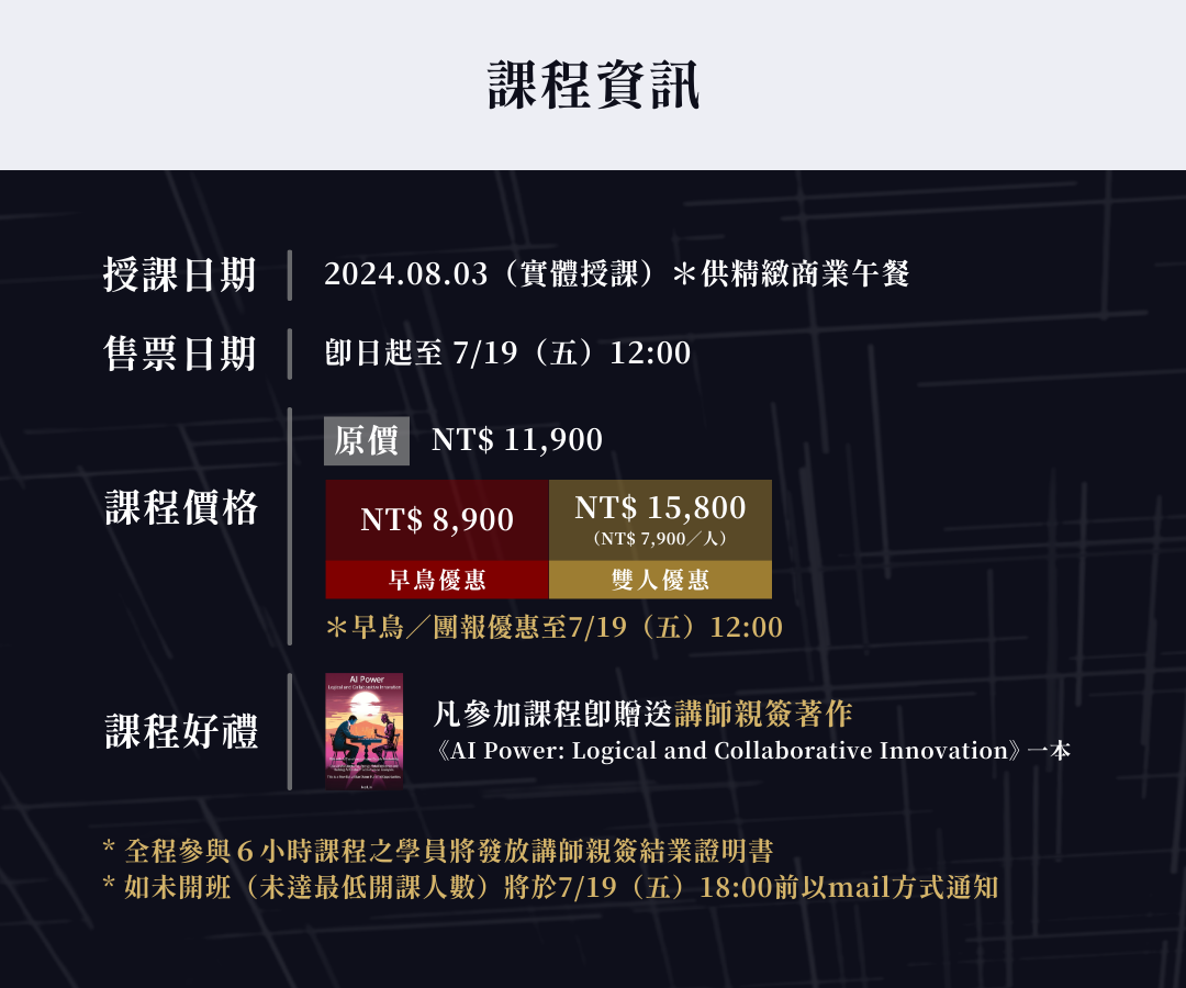 凡參加課程者,即可於課程當日領取講師親簽著作《AI Power: Logical and Collaborative Innovation》。