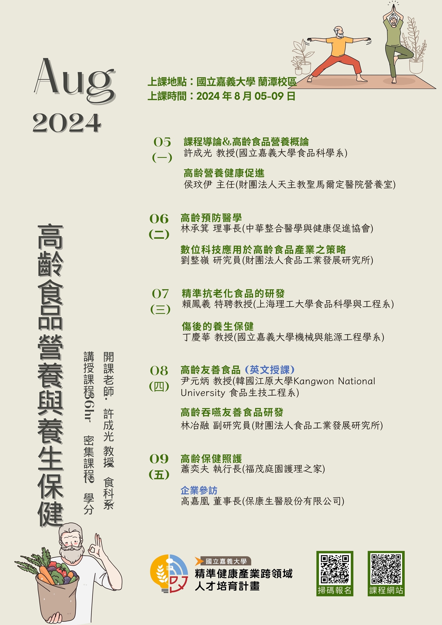 本課程為國立嘉義大學生命科學院執行教育部「精準健康產業跨領域人才培育計畫」夥伴學校計畫 所開設跨領域課程。
