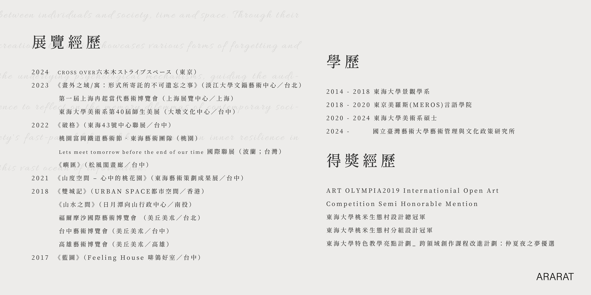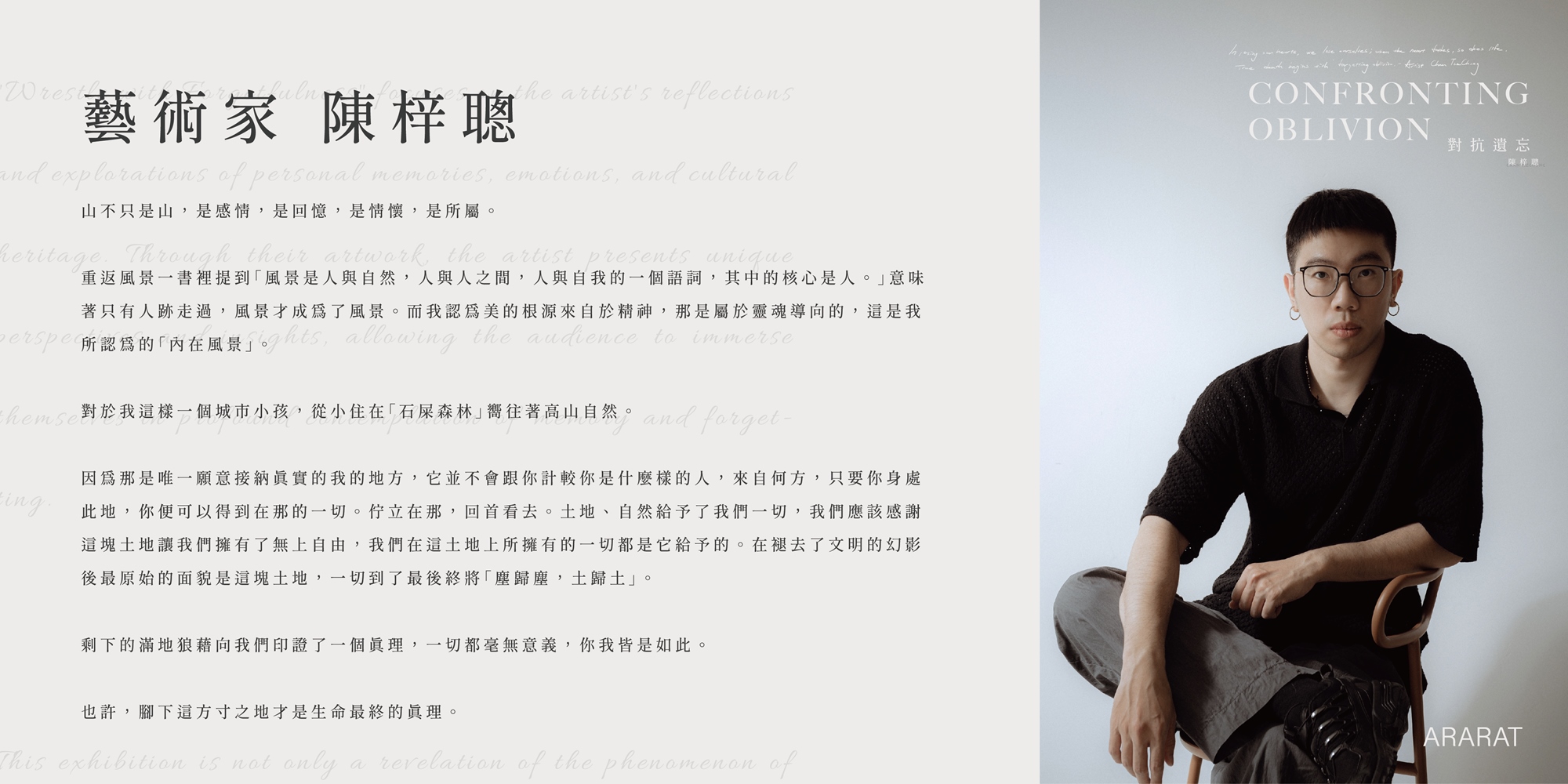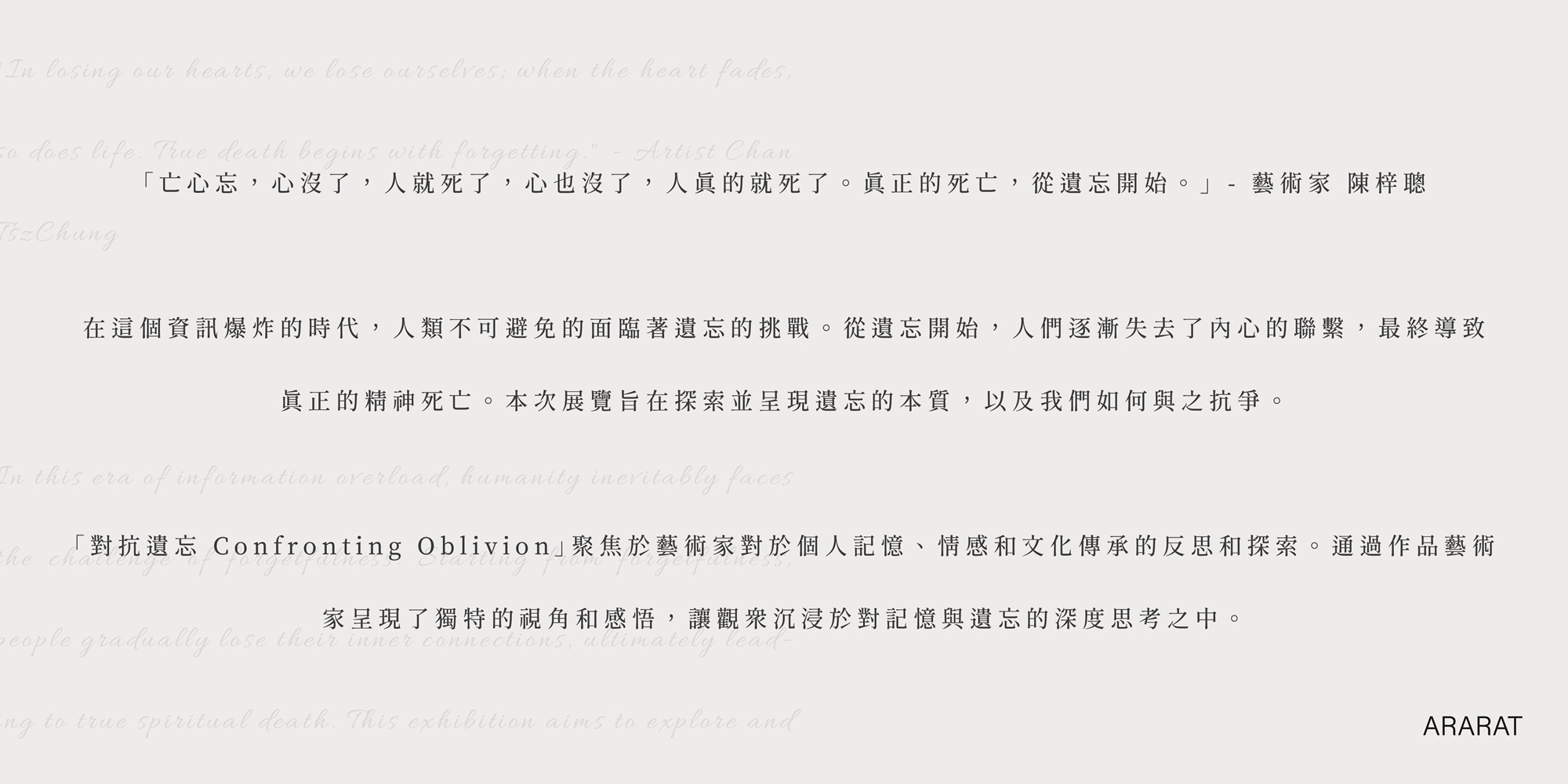 「對抗遺忘 Confronting Oblivion」不僅是一次藝術展示,更是一次思想的碰撞與啟迪。讓我們共同走進展覽空間,與藝術家一起,解構對抗遺忘與現今社會的衝突,挖掘你我內心深處的記憶。