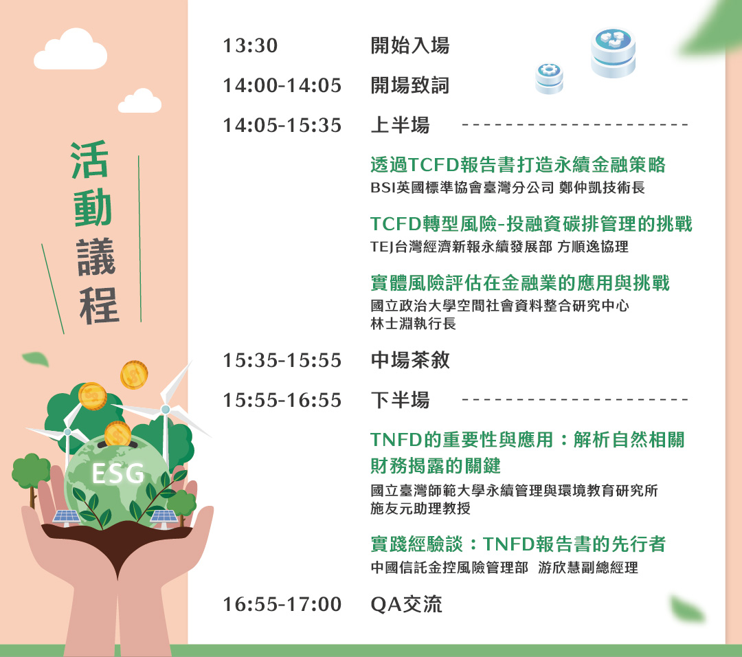📢TEJ ESG講座,針對TCFD與TNFD兩項主題,在[投融資減碳管理實務]和[與自然和諧共存-TNFD解析]邀請各界代表透過不同視角分享實務經驗,千萬不要錯過!