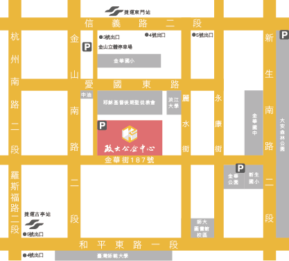 ● 新店線(綠線)/蘆洲線(橘線)→古亭站5號出口:沿和平東路左轉金山南路,再至金華街口右轉,步行約12-15分鐘