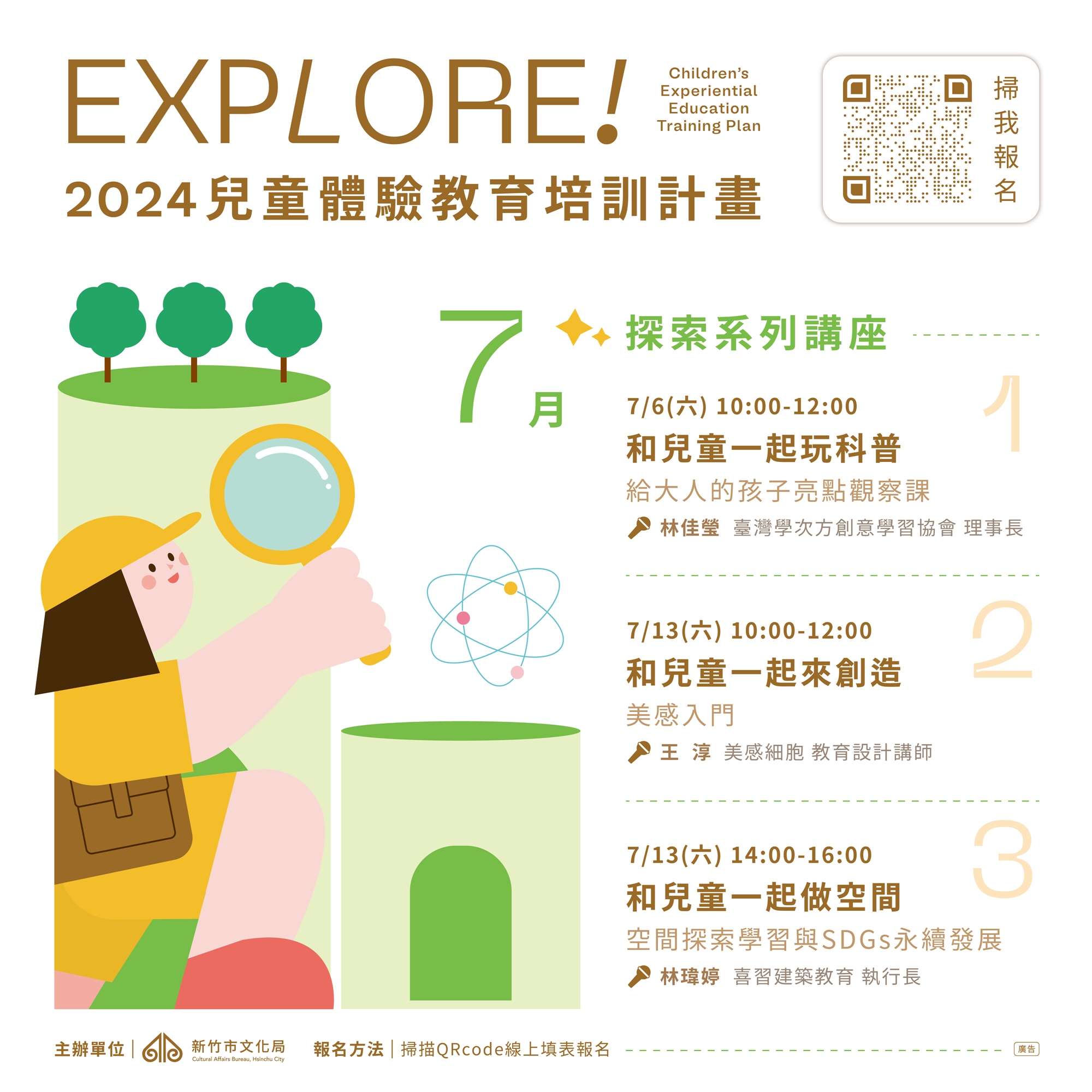 《Explore!兒童體驗教育培訓計畫》規劃3場探索系列講座、3場設計實作工作坊。