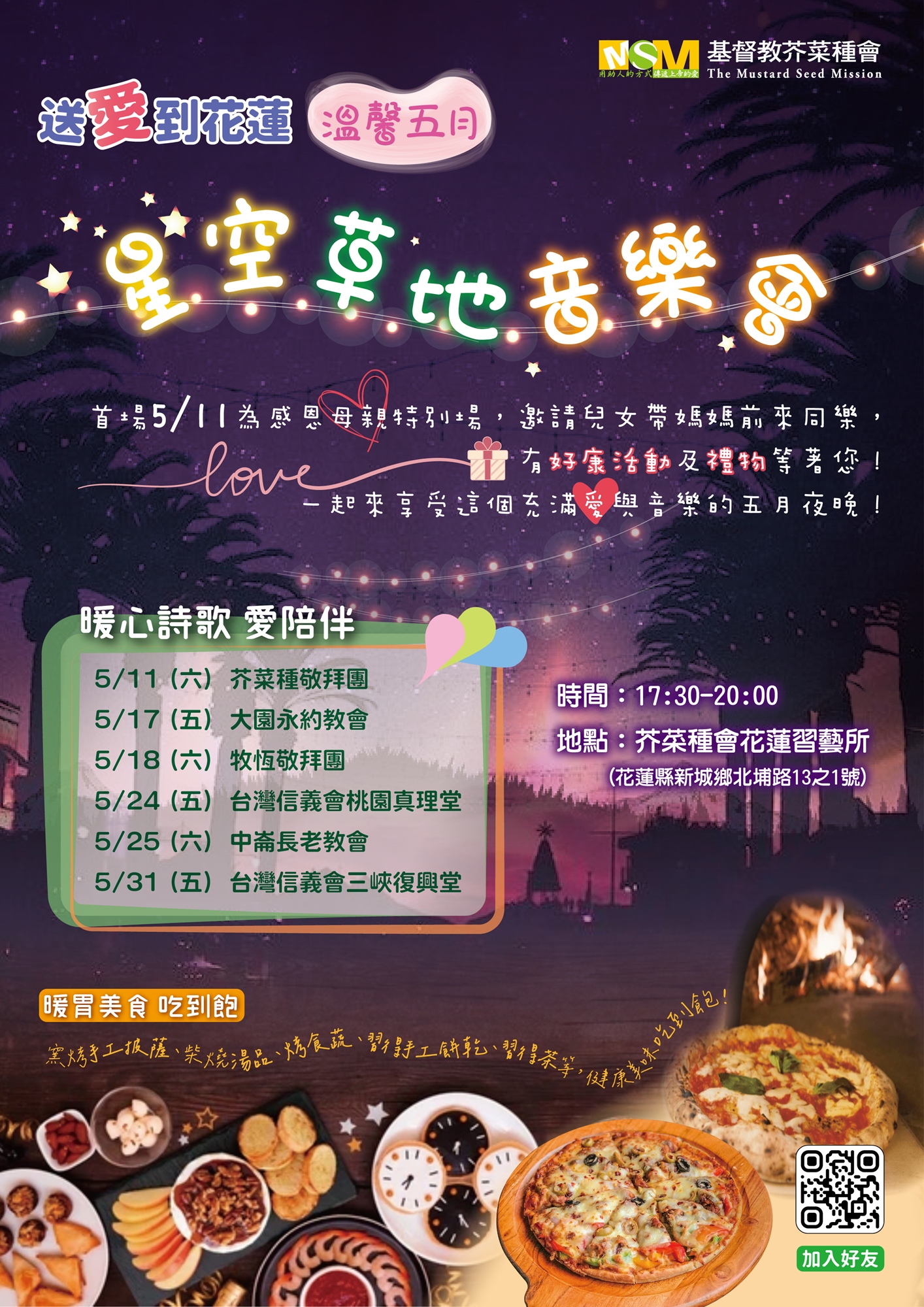 除了暖心詩歌之外,還有暖胃美食吃到飽,包括窯烤手工披薩、柴燒湯品、烤食蔬、習得手工餅乾、習得茶品等,健康又美味。首場活動於5月11日舉行,是特別籌備的感恩母親場次,邀請大家帶著摯愛的媽媽一同來參加,有豐富的好康活動和禮物等著您們!歡迎闔家蒞臨,共享這個充滿愛和音樂的五月夜晚。