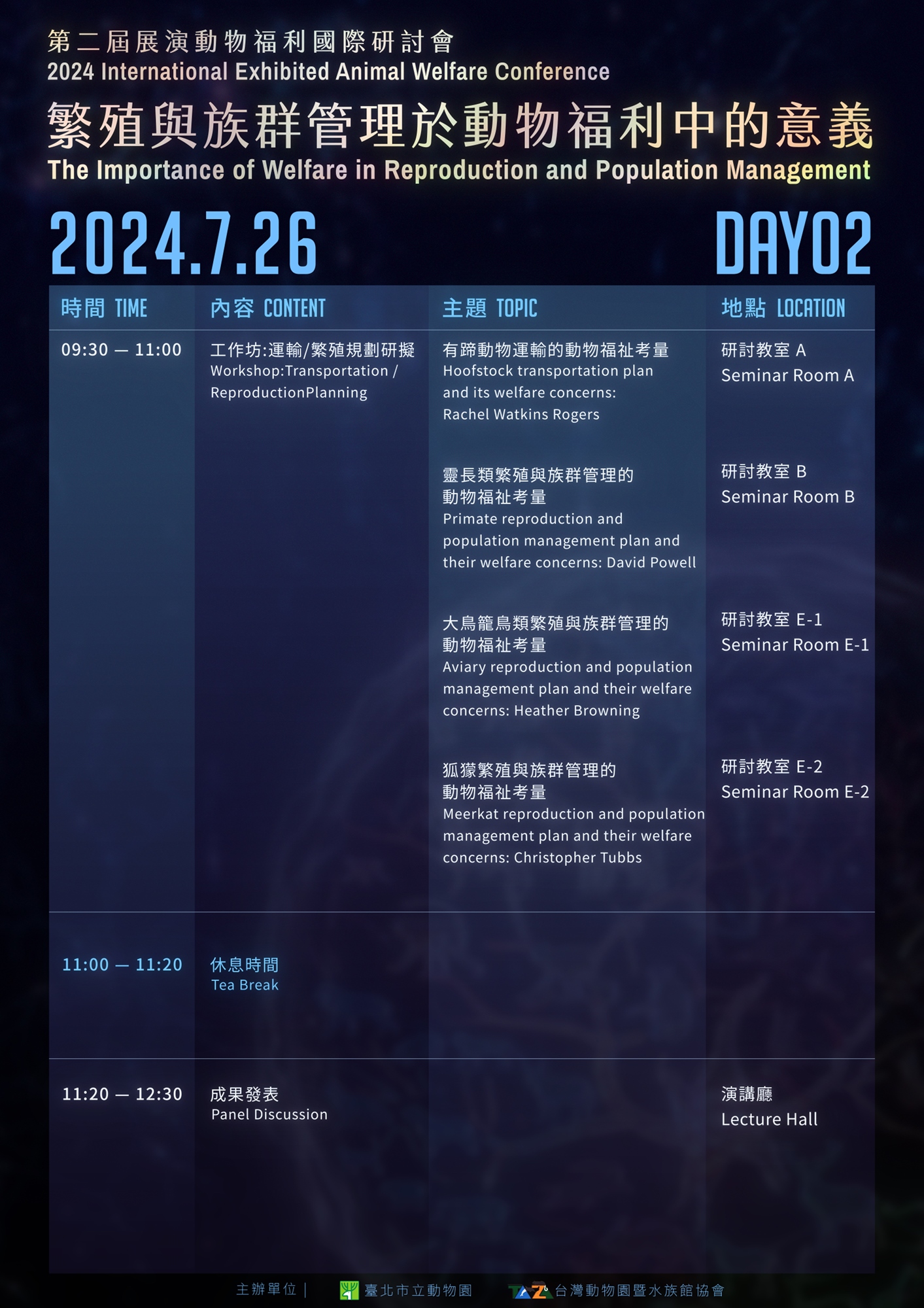 為了更深入探討動物園與水族館繁殖與族群管理中動物福利的議題,本研討會以演講搭配工作坊的型式進行。演講的部分邀請到四位國外學者與業界專家,來臺講授「動物移動/運輸過程中的福利」、「動物繁殖對生活品質的損益」、「動物繁殖技術與其福利疑慮」與「過剩動物的處理」等相關主題內容,分享國際在實務執行上與科學發展上的最新趨勢。另外,展演輔導小組也將針對「動物運輸規範」、「動物流向追蹤」、「國內物種族群管理程式應用」與「物種展示手法與族群管理」四個子主題,進行主題輔導短講。