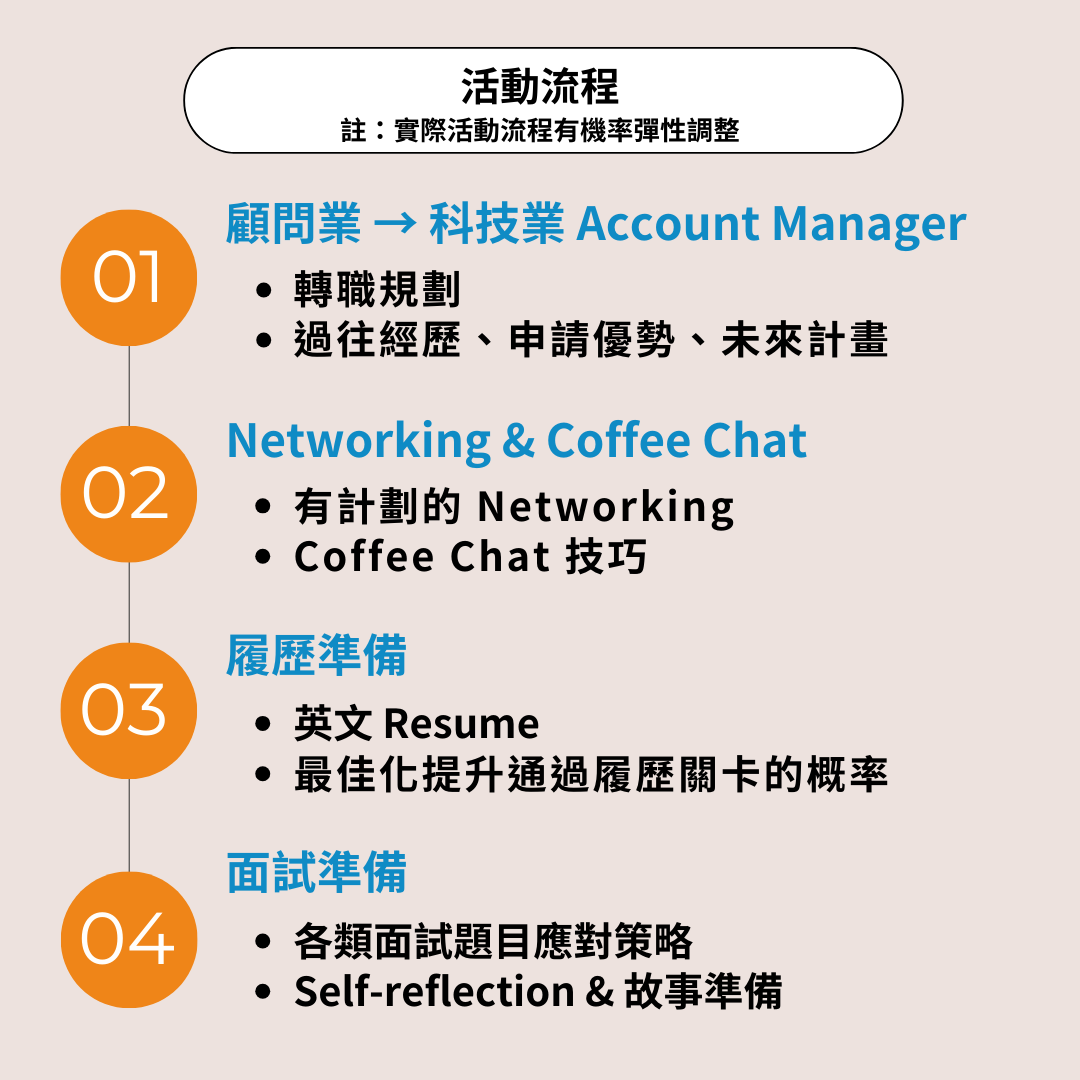 商管學科畢業後,從事兩年顧問職務。並在一個月內,從顧問業轉職至科技業,目前收穫外商 Account Manager & Program Manager Offer!