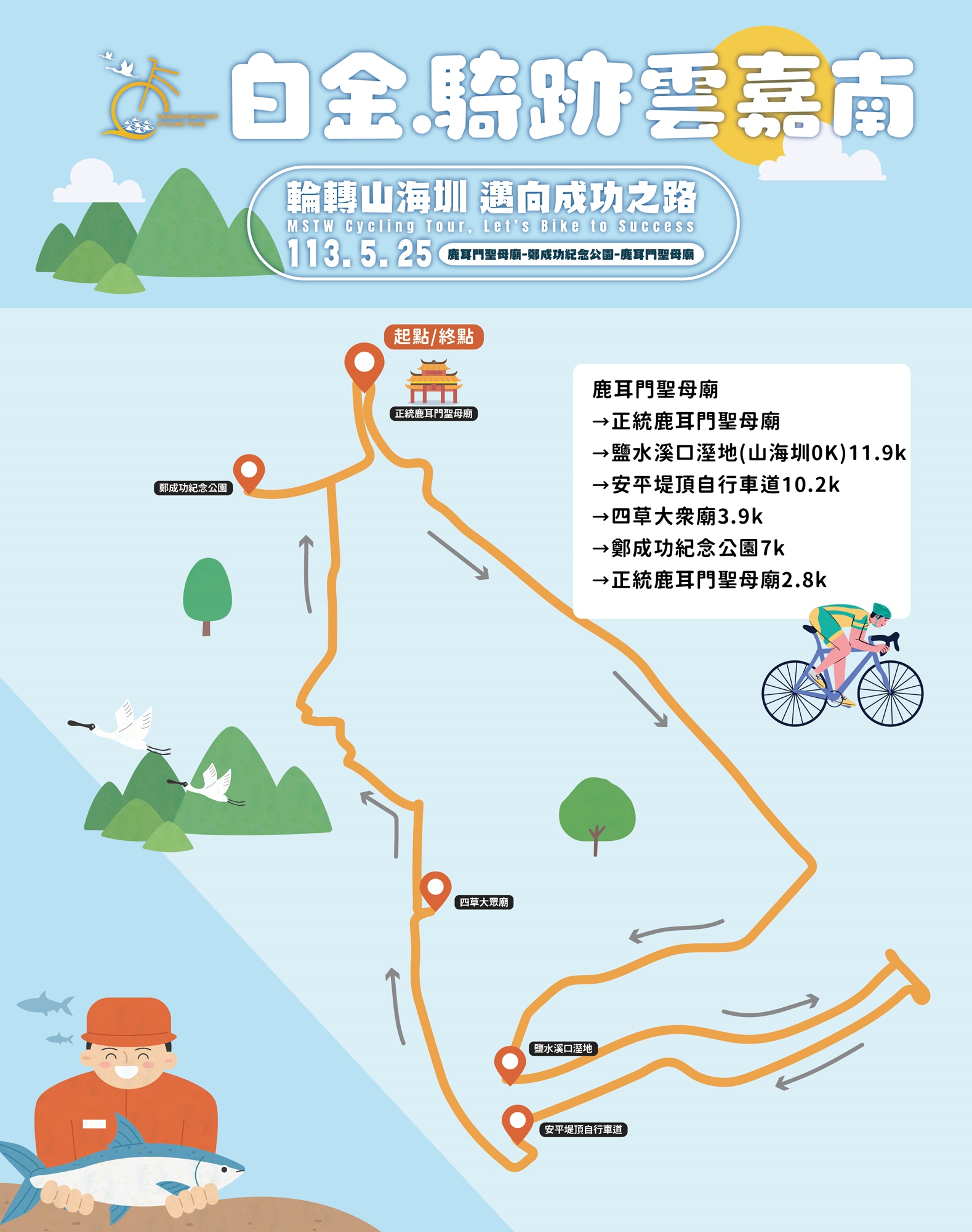 活動開始,COSER們會和所有的車友們在廟埕內排出「成功」二字,高喊口號後,一起騎車出發,一路前往山海圳、鄭成功紀念公園、最後再繞回聖母廟之外邁向成功。