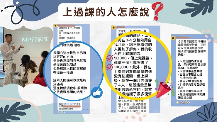 NLP行銷學課程教你如何成為一名行銷高手,透過三小時的分享可以學習到NLP的行銷三步驟不論你是想賣產品、服務,或者推廣課程,這些技巧都可以幫助你讓人們對你的內容產生興趣,並且成功成交!