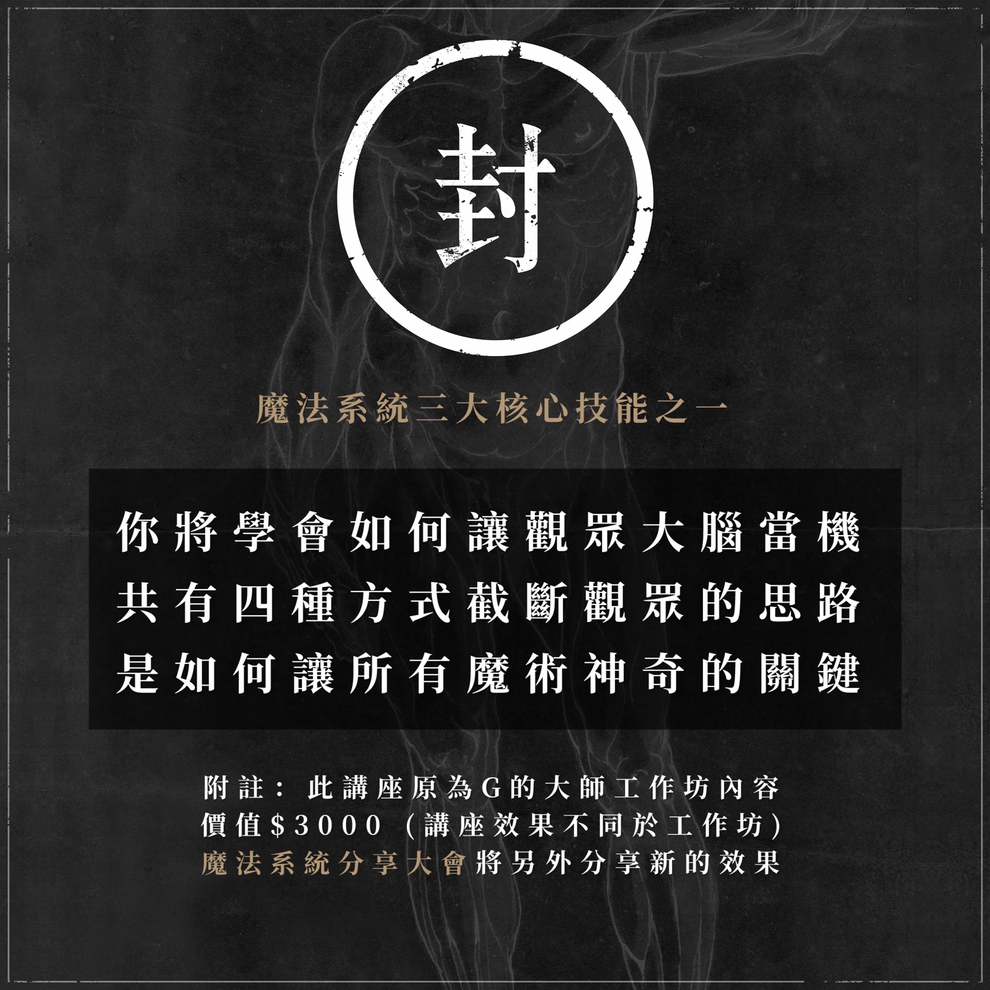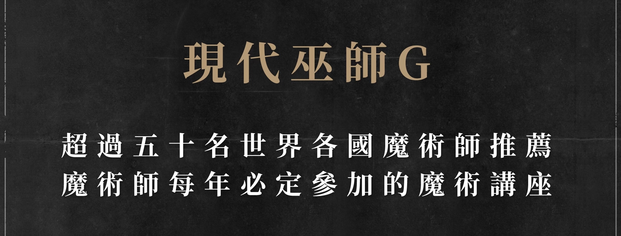 另一方面,G 也是一位世界頂尖的魔術創作者、表演者和專業顧問。過去十七年來,G 幾乎每年都會舉辦全台巡迴講座,是全台灣魔術師每年必來朝聖的活動。至今已發表累計超過上百種原創魔術、原理和手法,這些作品受到全世界魔術師的高度推崇,並廣泛受到大家使用。