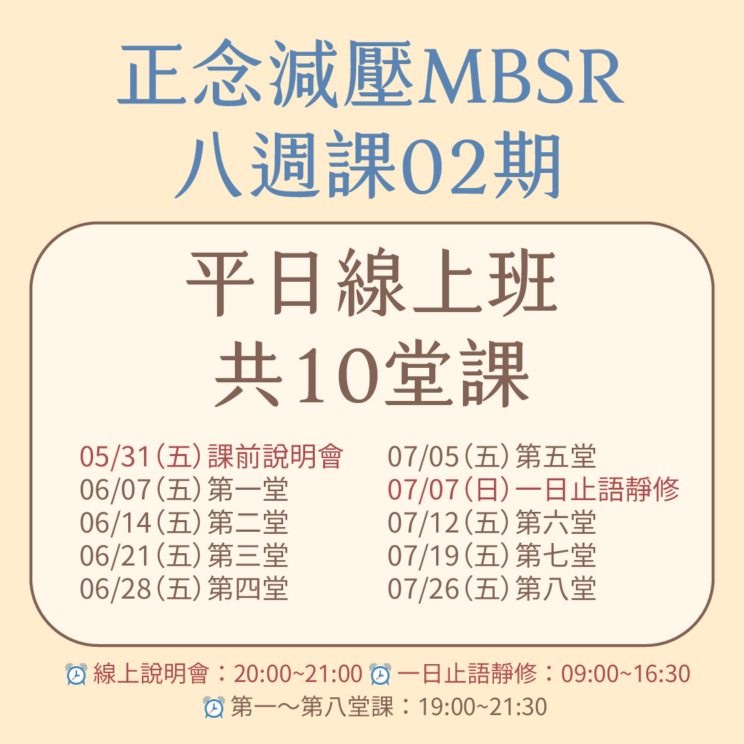- 此課程為配合台灣正念工坊之正念減壓(MBSR)八週課程師資培訓第四模塊所開設的實習班,課程中將有部分錄音錄影,主要用途為紀錄老師的授課狀況,紀錄內容僅作為帶領老師 – 林冠妏老師與督導老師進行一對一個別督導使用,不作其它用途。