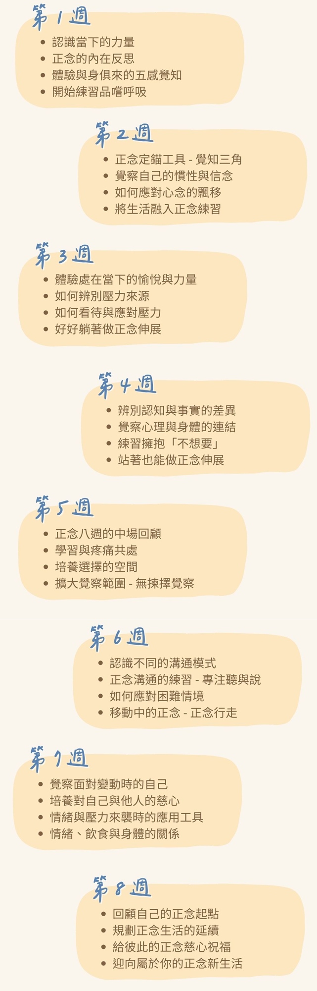 八週的正念旅程,是一段深化自我覺察,強化專注力的內在之旅。透過兩個月系統化的學習,配合自由彈性練習,能為你循序漸進提升生活品質。