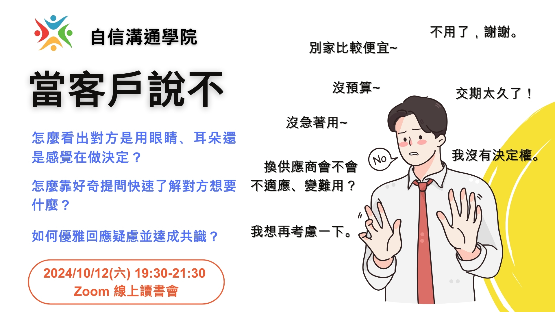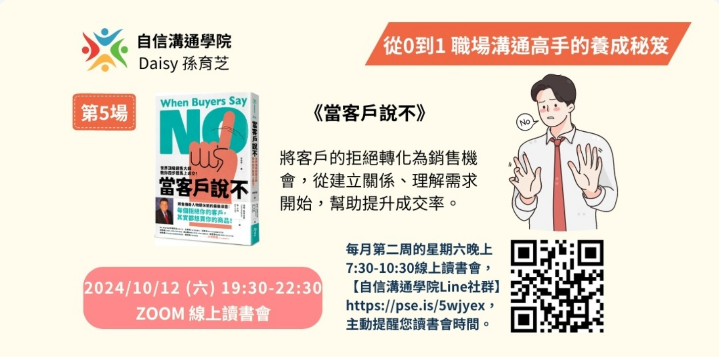 - 2024/10/12 (六) 19:30 讀書會《當客戶說不:世界頂級銷售大師教你四步驟馬上成交!》作者: 湯姆.霍普金斯, 班.卡特 ,出版社:今周刊