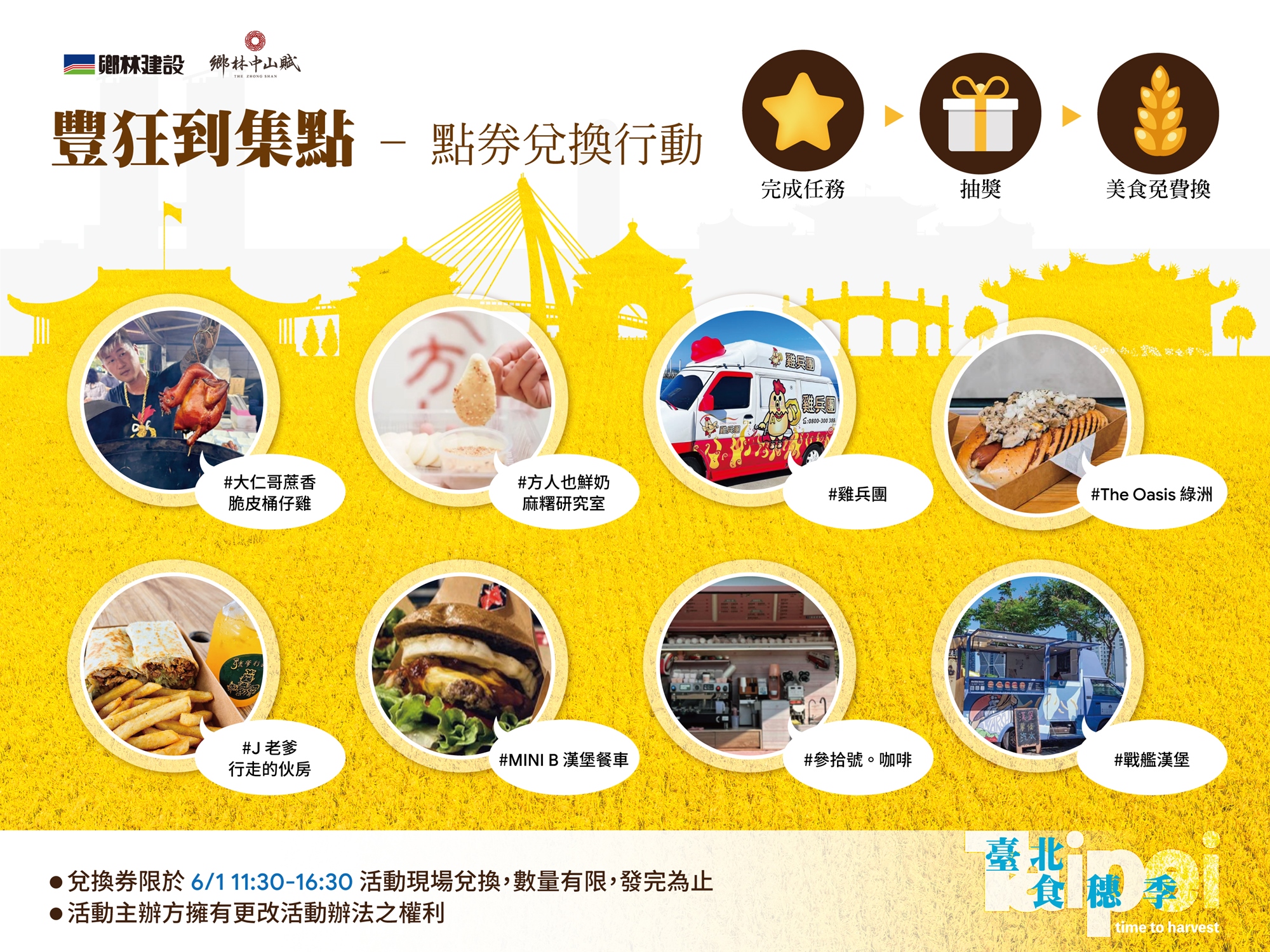 1. 於竹林區拍美照、上傳IG貼文標註 #臺北食穗季 #鄉林中山賦並@鄉林建設,可抽美食兌換券乙張