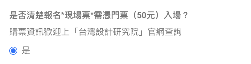 ※ 因系統設定問題,本場活動『不』需另外再購買台灣設計館票券,請忽略報名表中此問題(如圖),感謝您的體諒。