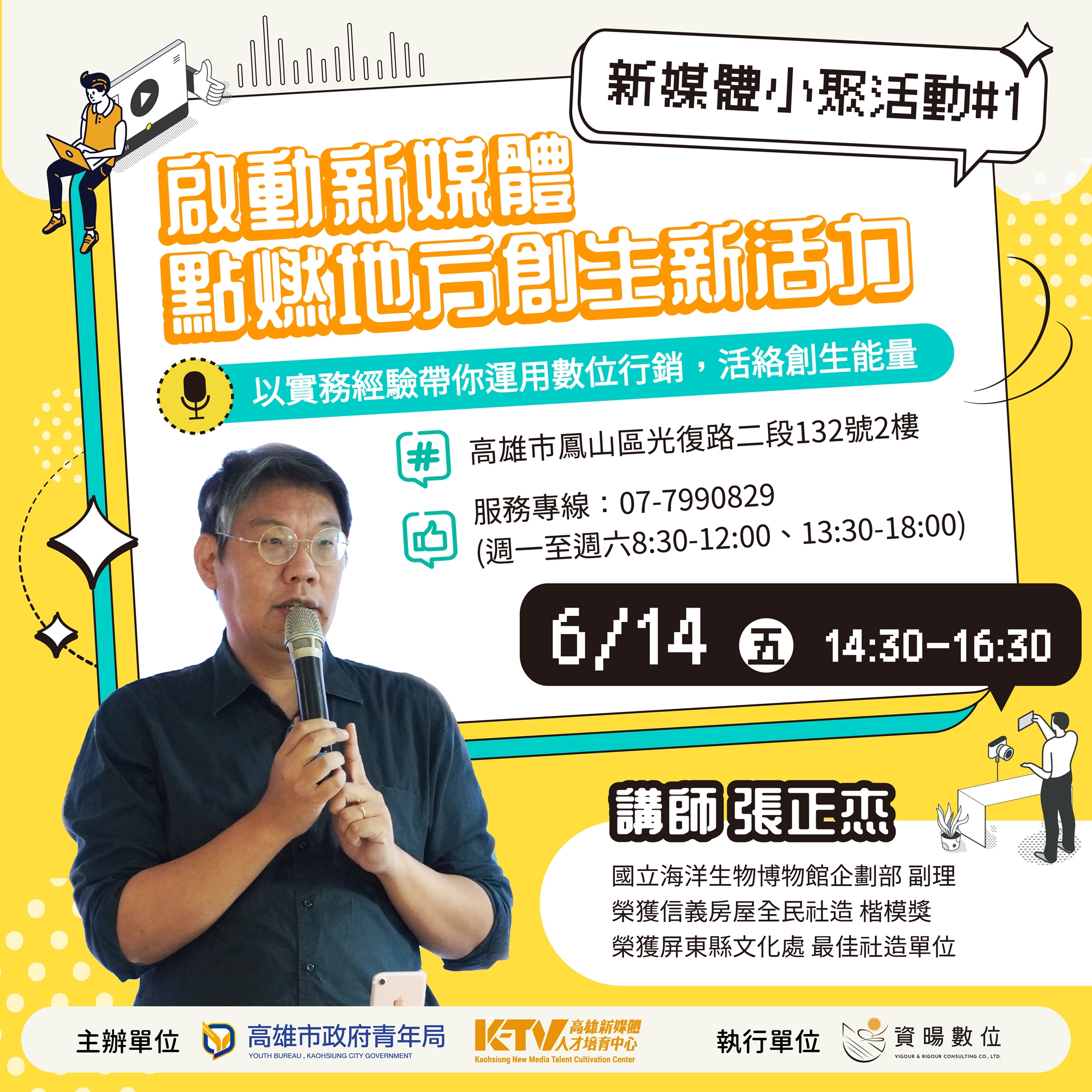 邀請到業界資深專家張正杰先生,將帶領大家深入探索如何運用新媒體,點燃地方創生的新活力,無論您是社區推動者、對地方發展有熱忱或是對新媒體應用感興趣的朋友們,絕不要錯過本次講座🔥