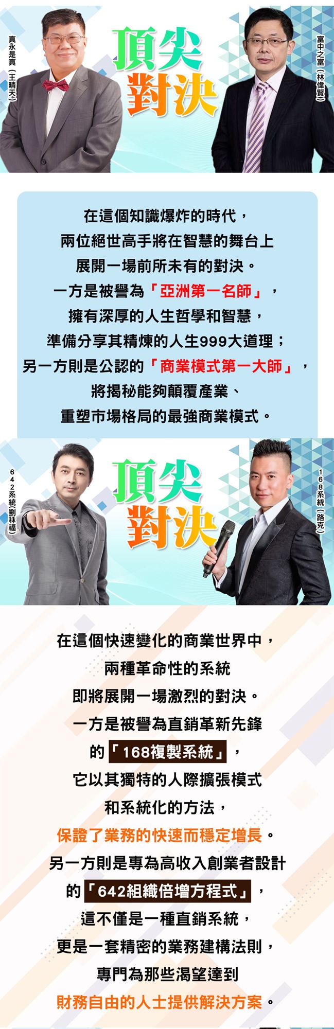 ⚔️🧠 一方是被譽為「亞洲第一名師」,將分享其精煉的人生999大道理;另一方是公認的「商業模式第一大師」,將揭秘能夠顛覆產業、重塑市場格局的最強商業模式。兩種革命性的系統將在這個快速變化的商業世界中展開一場激烈的對決!💼💡