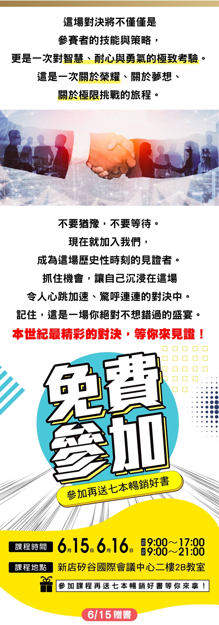📅 日期:2024年6月15日、6月16日 🕘 時間:早上9點開始 📚 免費參加再送七本暢銷書!