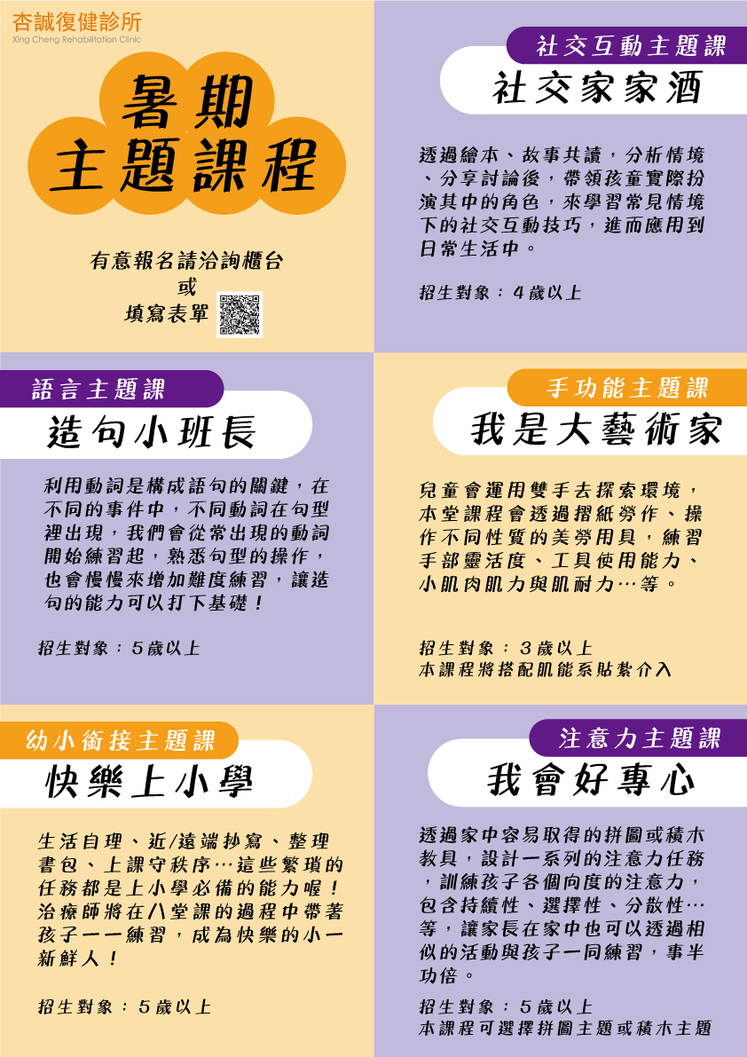 生活自理、近/遠端抄寫、整理書包、上課守秩序…這些繁瑣的任務都是上小學必備的能力喔!治療師將在八堂課的過程中帶著孩子一一練習,成為快樂的小一新鮮人!