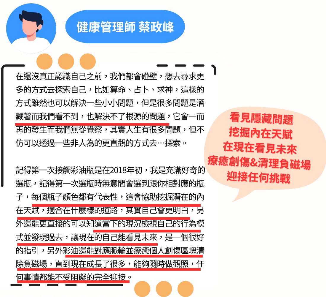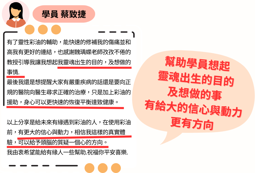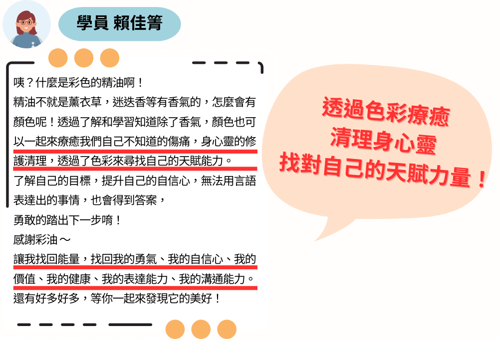 透過色彩療癒,可以看見你自己的天賦特長,以及你欠缺的部分;搭配老師所教的療癒方式,會幫助你更有力量走在自己人生的道路上!