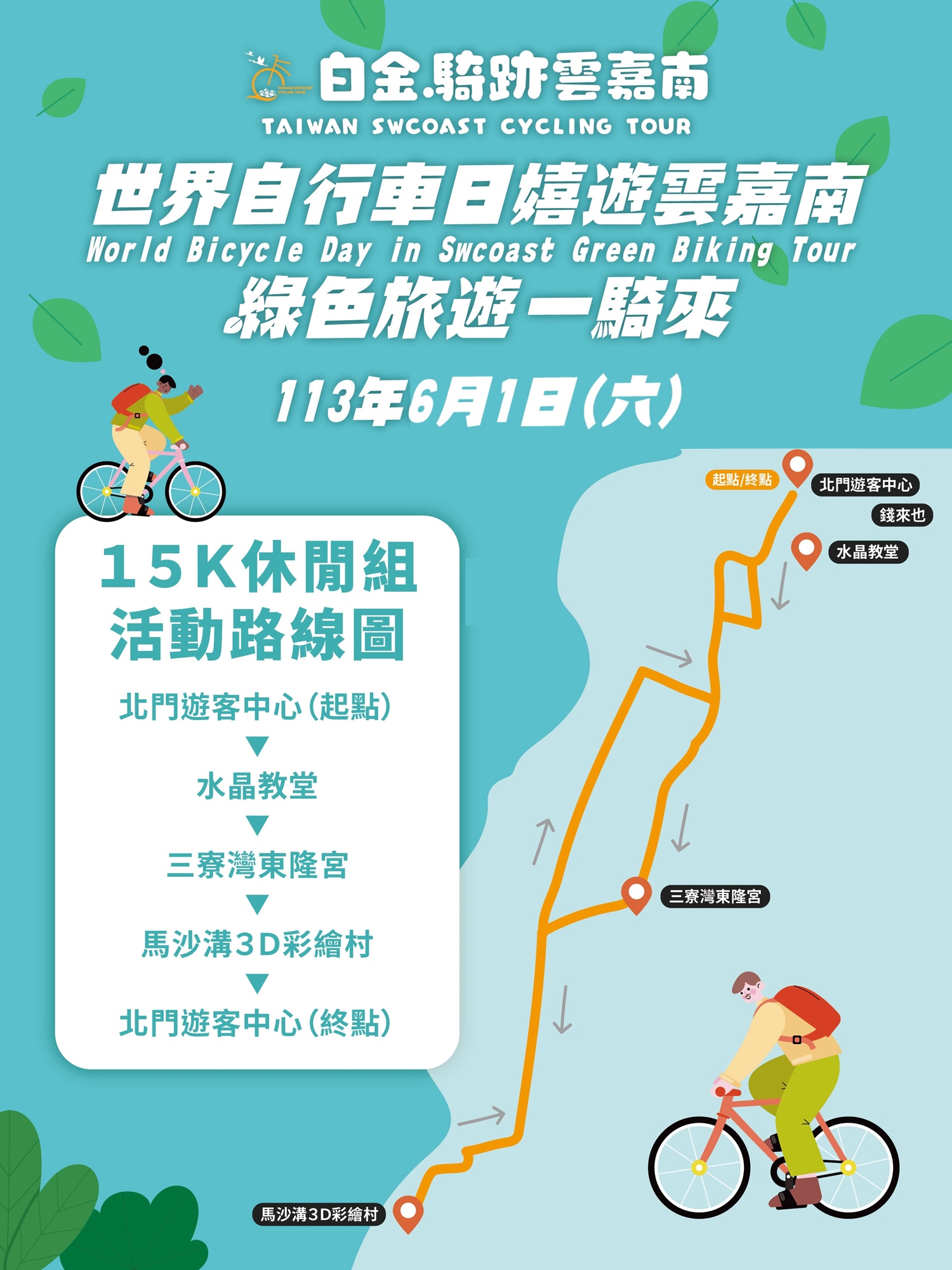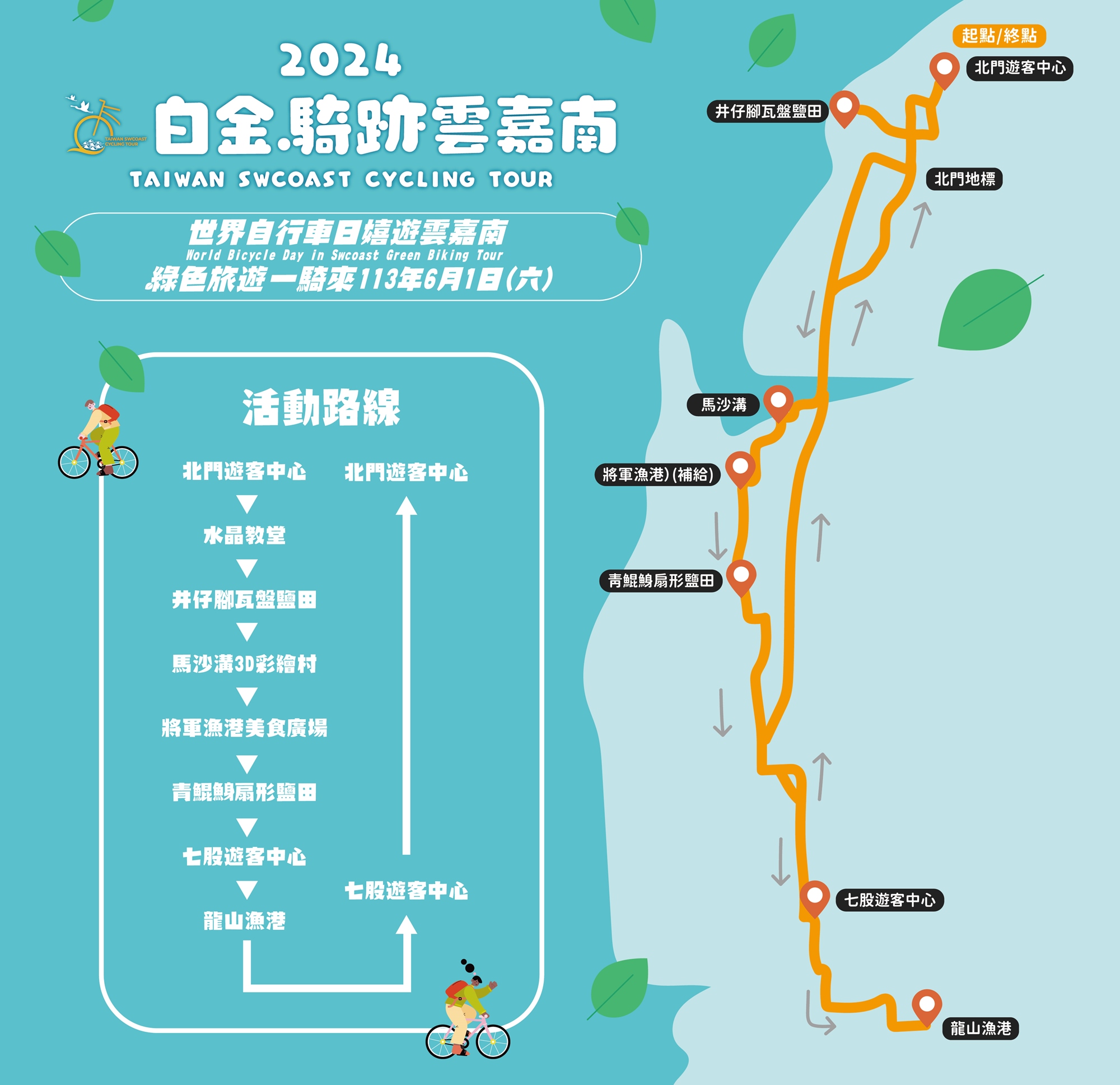 交通部觀光署於2024/6/1辦理6月3日世界自行車日舉辦全台串連活動,雲嘉南濱海國家風景區管理處邀請全臺灣外愛好自行車活動的大朋友以及小朋友們共襄盛舉,一起騎上自行車,暢遊多元路線濱海型「夕鹽」以及「台江」段,以節能減的綠色旅遊,朝向淨零碳排的目標來大步前進。