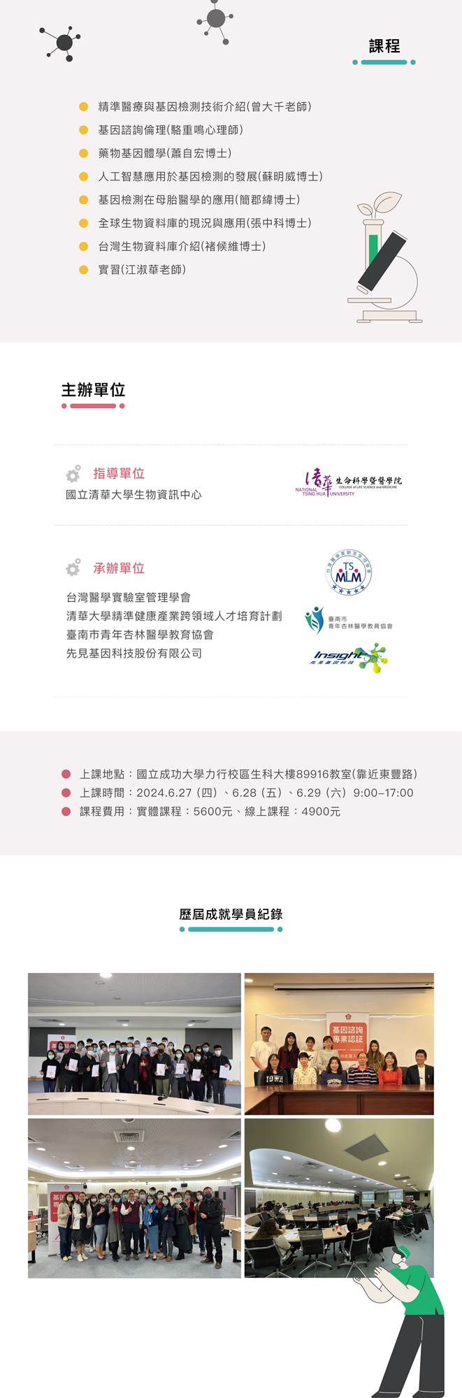 台灣醫學實驗室管理學會、清華大學精準健康產業跨領域人才培育計劃、臺南市青年杏林醫學教育協會、先見基因科技股份有限公司