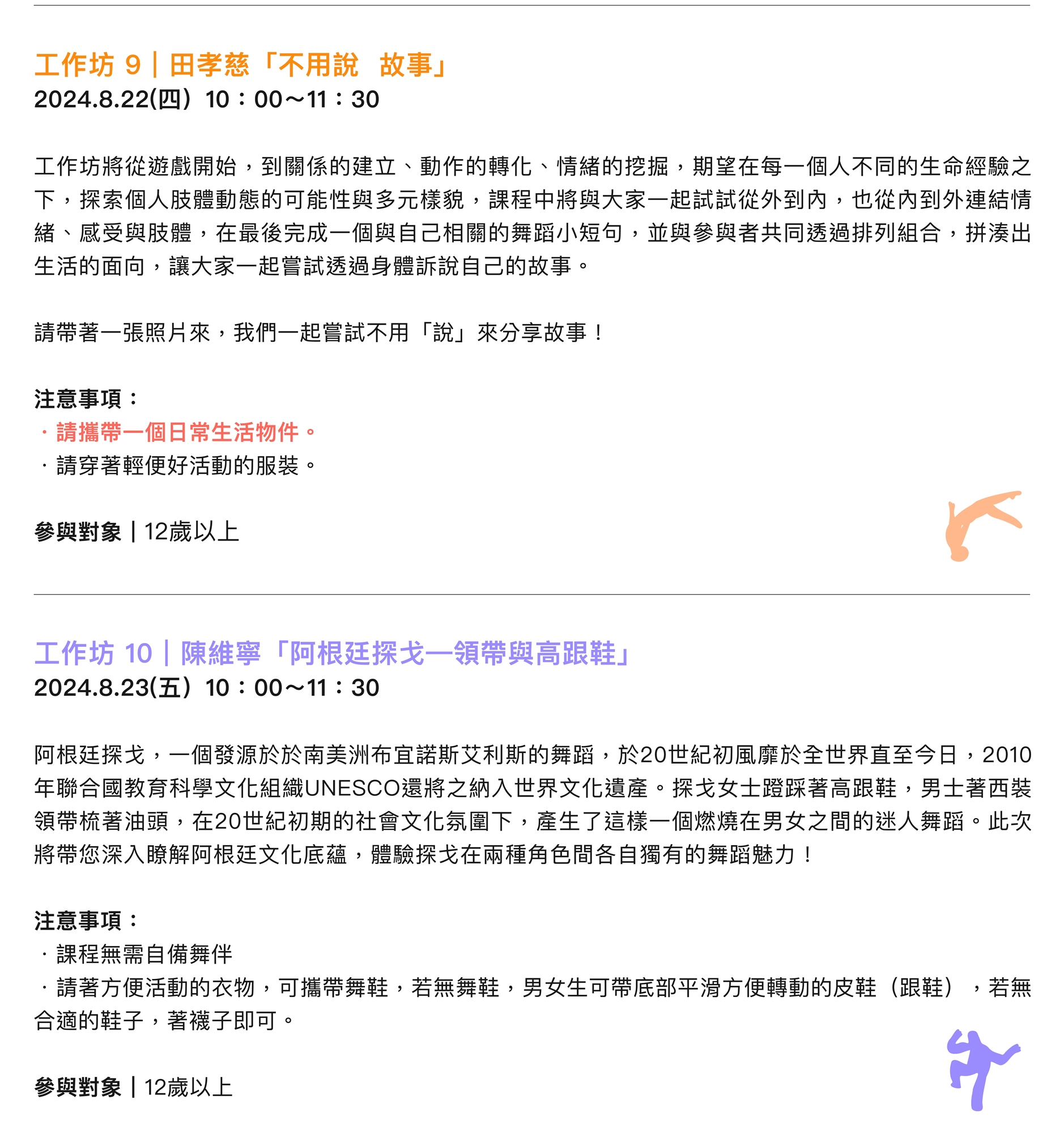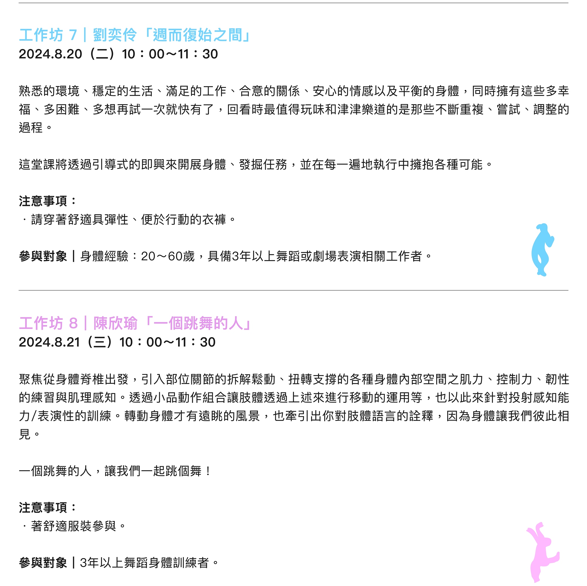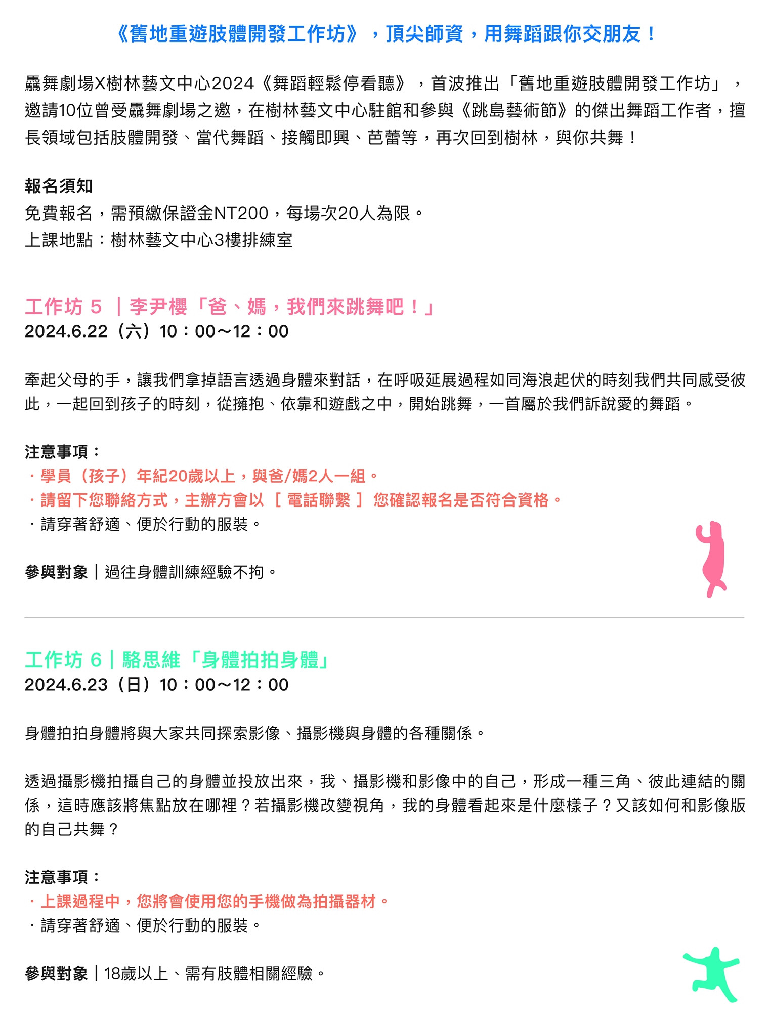 ➤ 為維護活動品質,報名參與肢體開發工作坊之學員,上課遲到 15 分鐘者則無法參與課程內容,已報名者若未抵到活動現場保證金則不予退費。