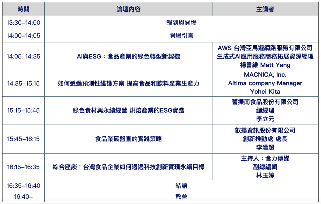 AI與數位科技不僅可以協助優化供應鏈管理和碳盤查精確性,進而降低產品碳足跡;亦可提高生產質量和能源使用效率,例如在生產過程中使用智慧感測器和自動化技術來監測設備運作,減少機器故障和停機時間,從而降低能源消耗和生產過程中的廢料產生。本次論壇將邀請來自不同領域的代表性專家,解析食品業ESG轉型發展趨勢、當前面臨的挑戰與因應對策;並探討創新數位科技在助力食品業者加速實現減碳和永續發展中的關鍵作用,俾助台灣食品業增強綠色競爭力,再創營運新高峰!