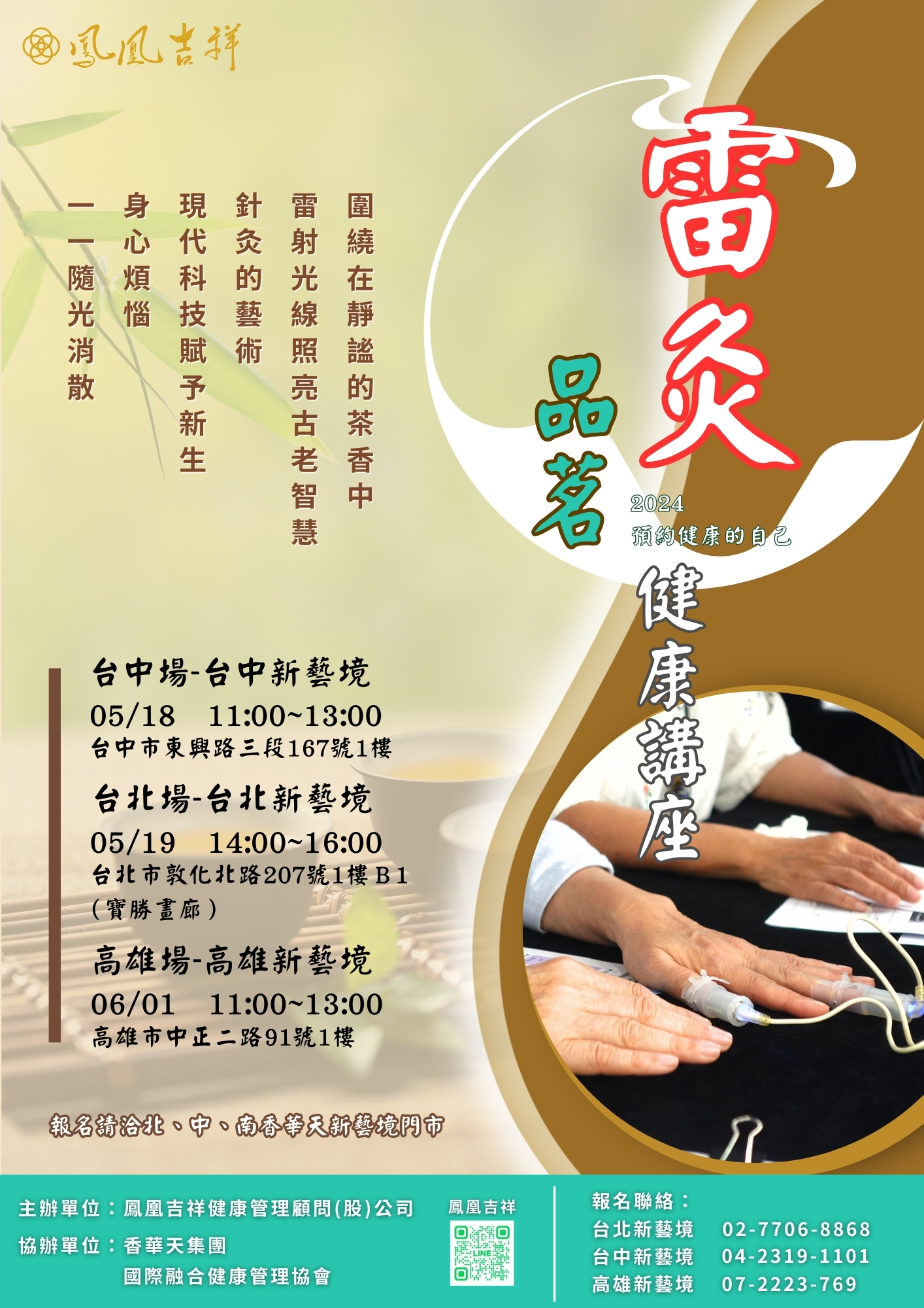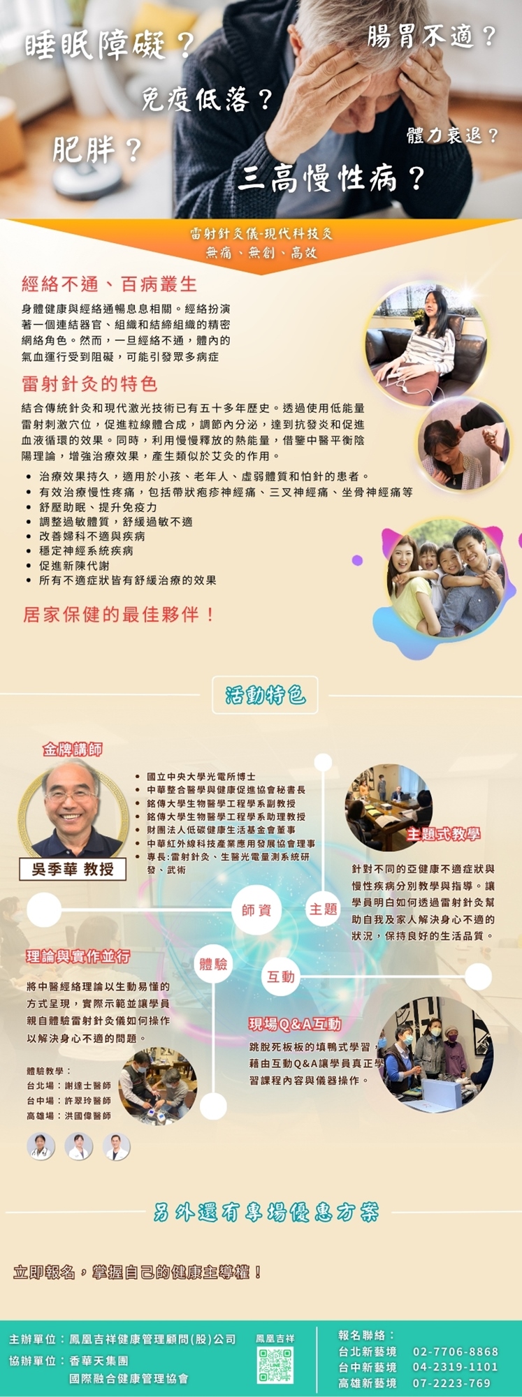 鳯凰吉祥健管中心即將舉辦的雷灸品茗健康講座,由雷射針灸專家吳季華教授主講,將為亞健康與慢性疾病患者帶來一場深入淺出的學習體驗。透過主題式教學與實作,參與者將學習如何利用雷射針灸這項非侵入性、無痛且安全的現代療法來提升身心健康。講座將結合理論與實作,並設有現場Q&A互動環節,以確保學員能夠活學活用,真正掌握雷灸儀器的使用技巧。我們誠摯邀請對雷灸保健感興趣的朋友參加,一起享受雷灸帶來的健康益處,提升生活品質。