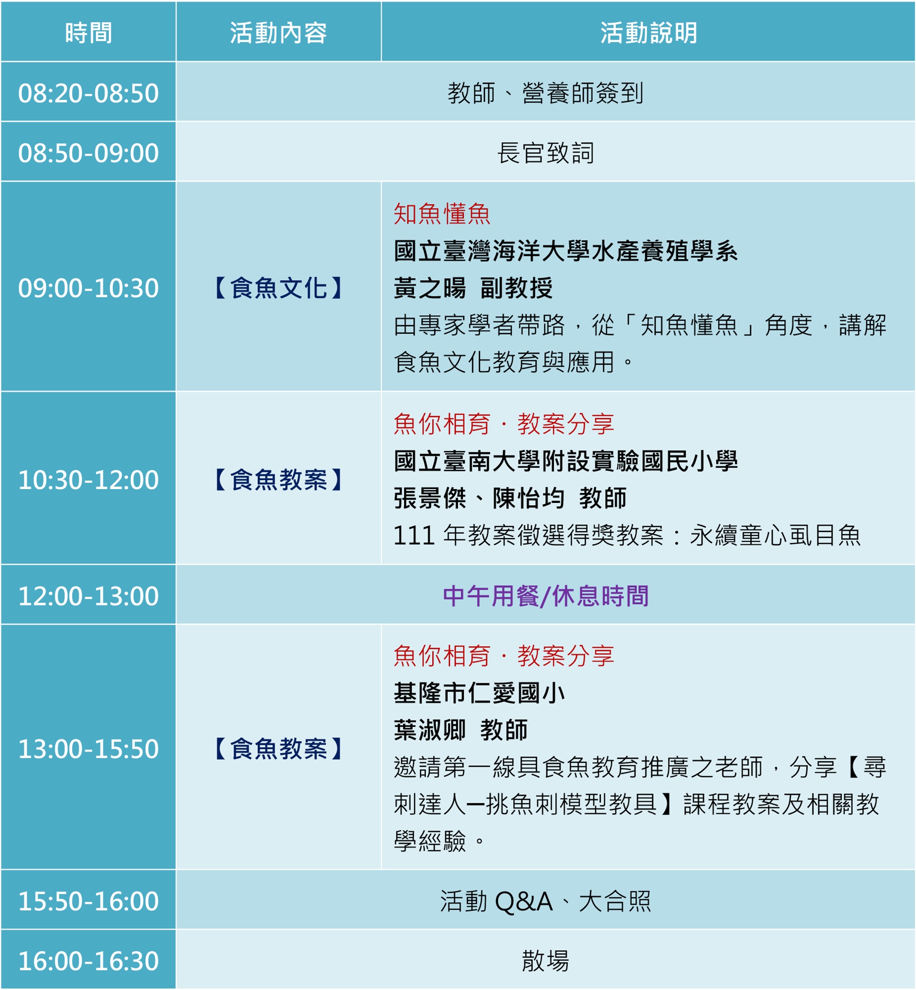 - 本課程全程免費。「教案研習工作坊」歡迎全臺高國中小教師、營養師、教職員、全臺公務人員、食魚推廣教育相關之工作人員踴躍報名,高國中小教師及工作人員將提供研習時數。