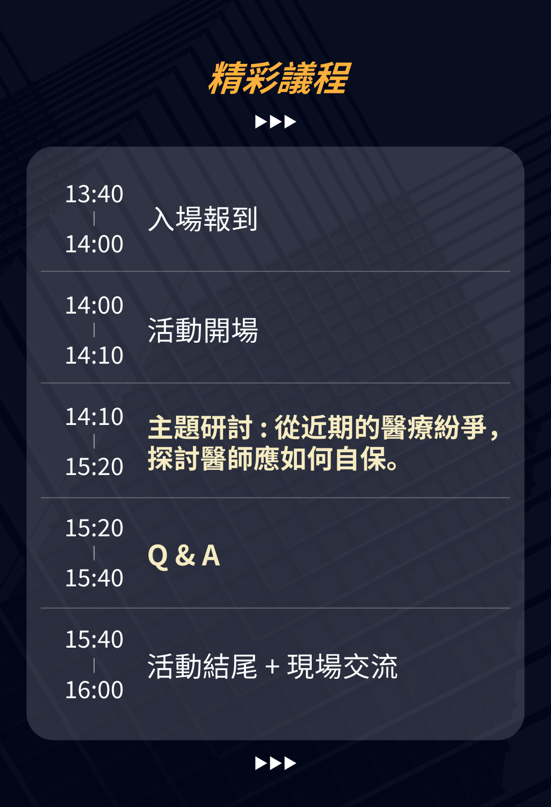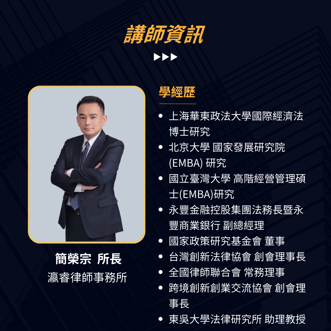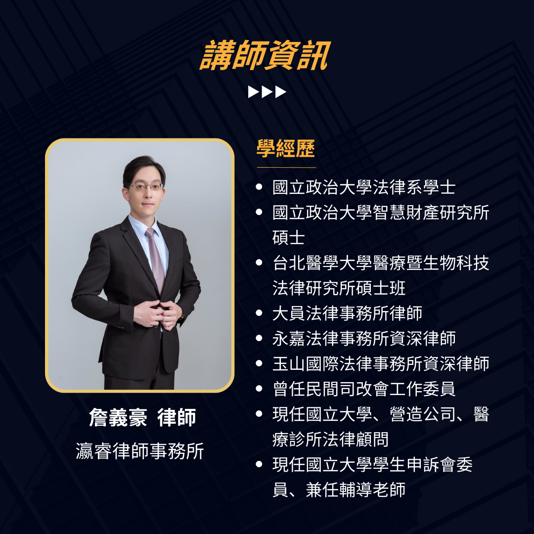 本次特邀具備協助醫療機構多年經驗、同時也是台灣多家知名優質診所的法律顧問【瀛睿律師事務所】,將由【詹義豪資深律師】及【簡榮宗所長】,透過真實案例的剖析,為您提供寶貴的法律知識與防範技巧,幫助您在日常醫療實踐中有效避免法律風險,提升您的專業能力與執業信心 !