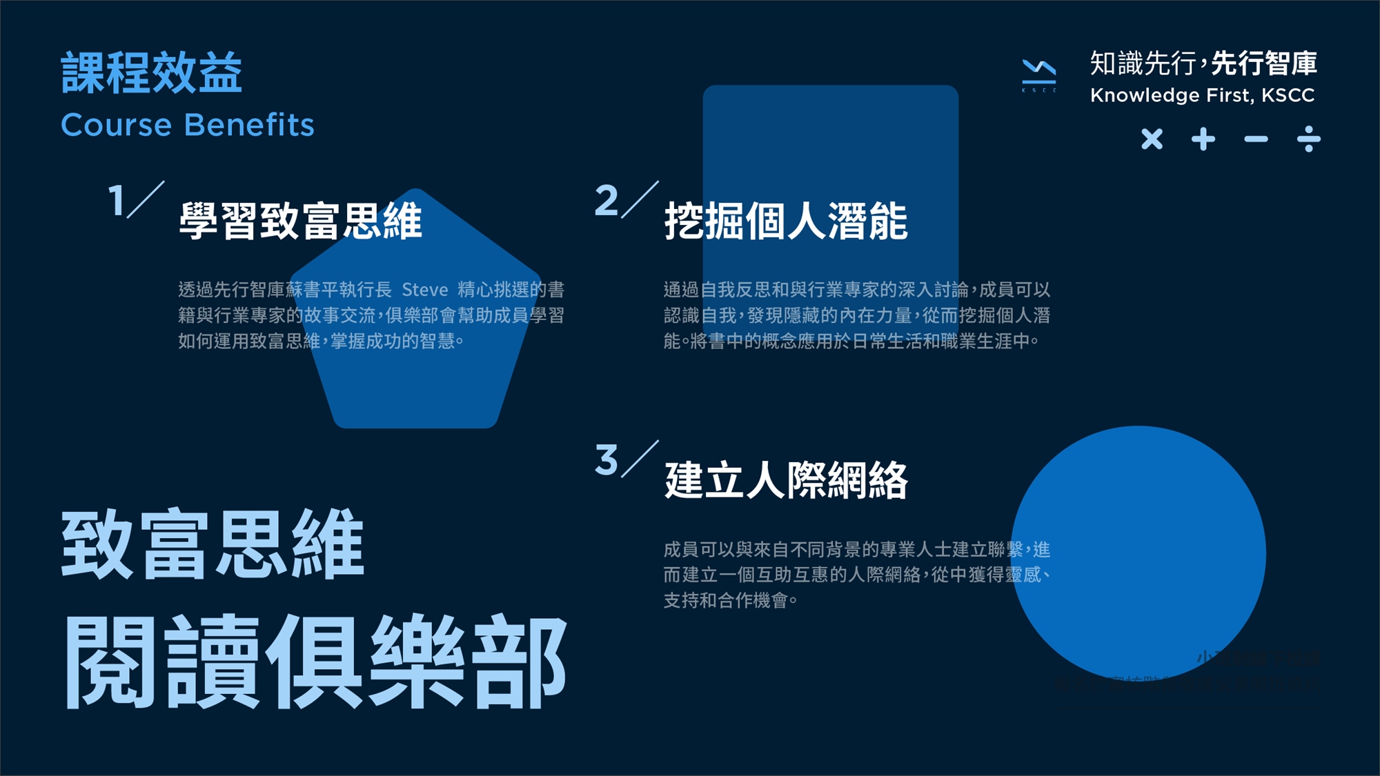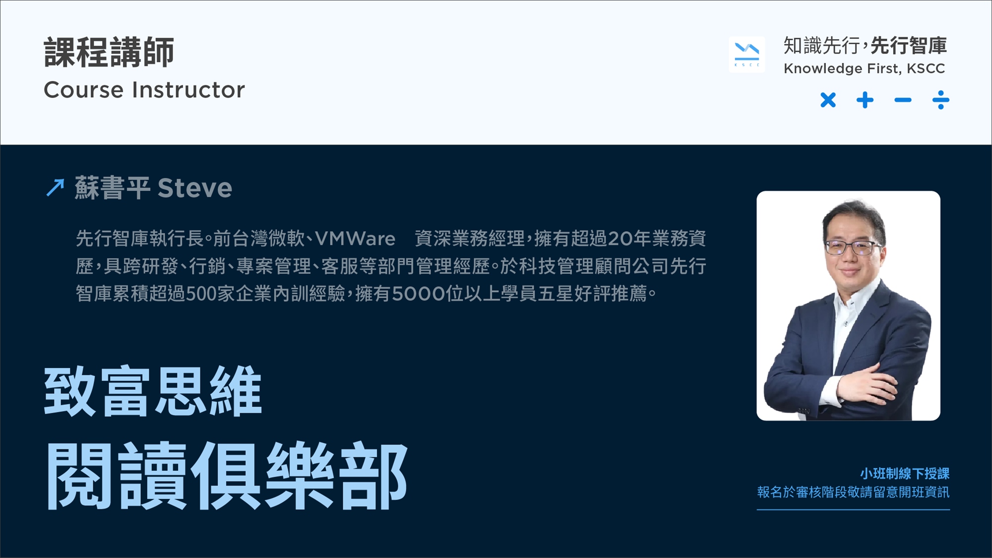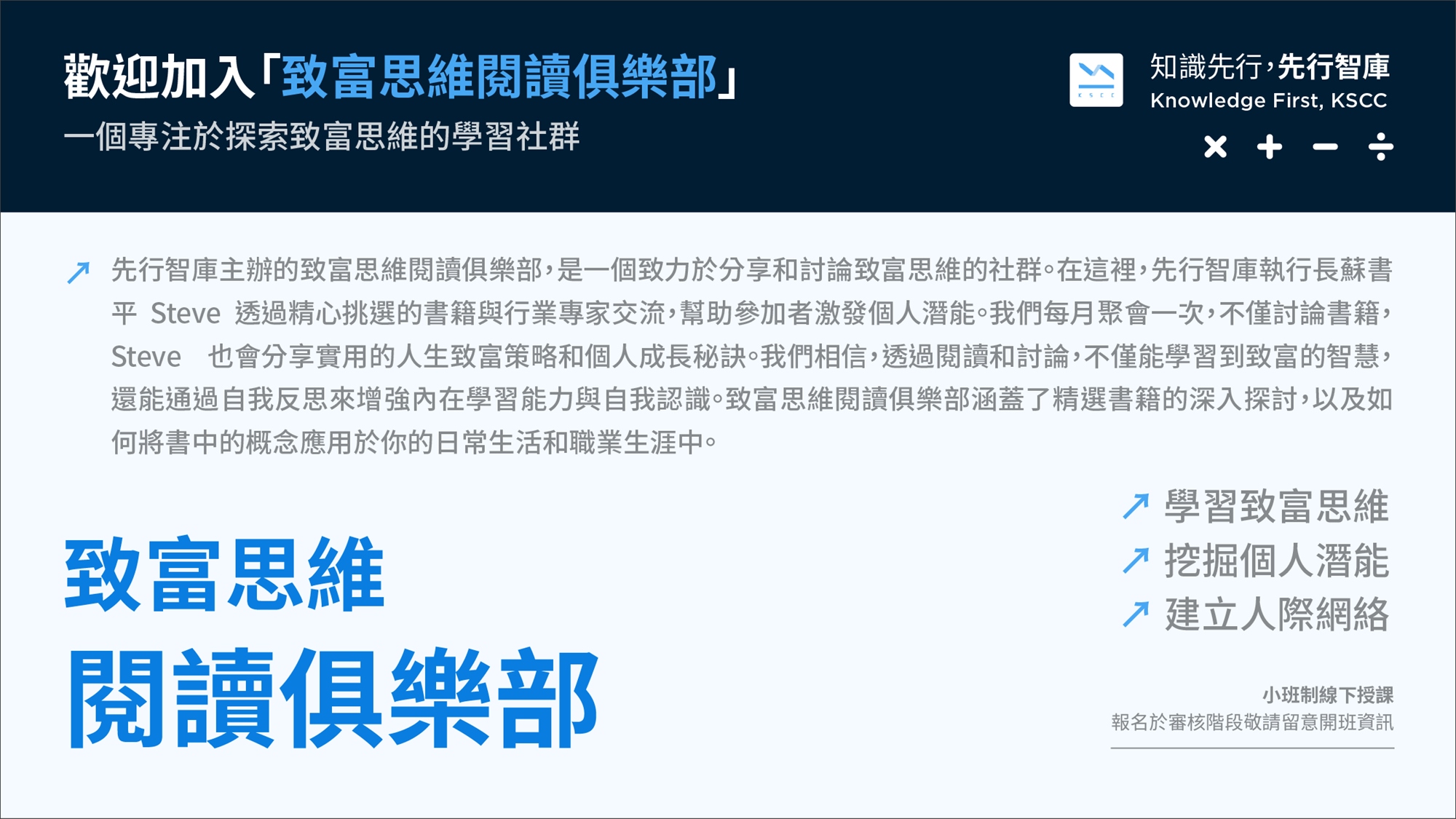 如果你熱衷於學習致富思維,並願意透過自我反思來實現個人成長,那麼請不要猶豫,立刻加入由先行智庫執行長蘇書平導讀的閱讀俱樂部。先行智庫期待與你一起,在書本和交流中尋找成功的秘訣,成為更好的自己。
