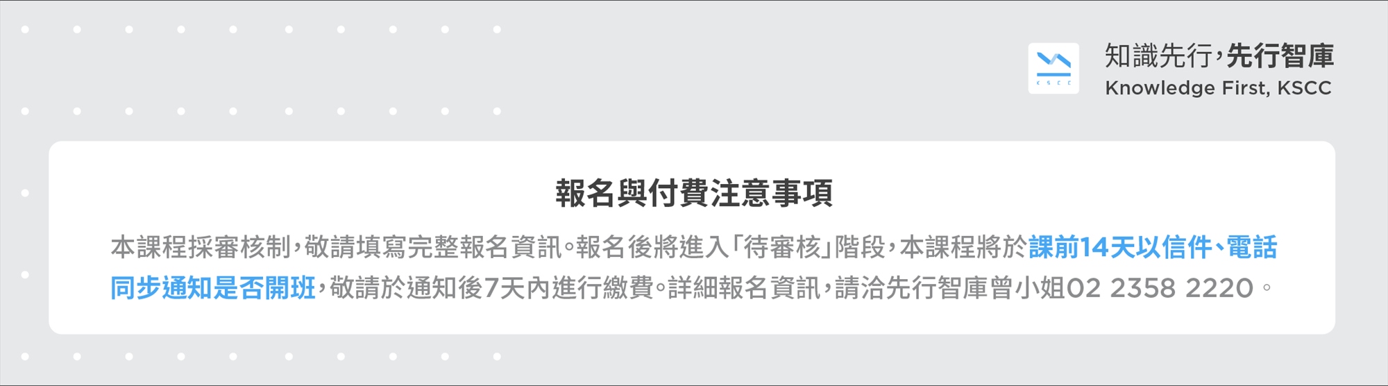 本課程除了颱風、地震等不可抗力天災因素,否則無法受理延期、退款需求,報名前敬請留意,謝謝!