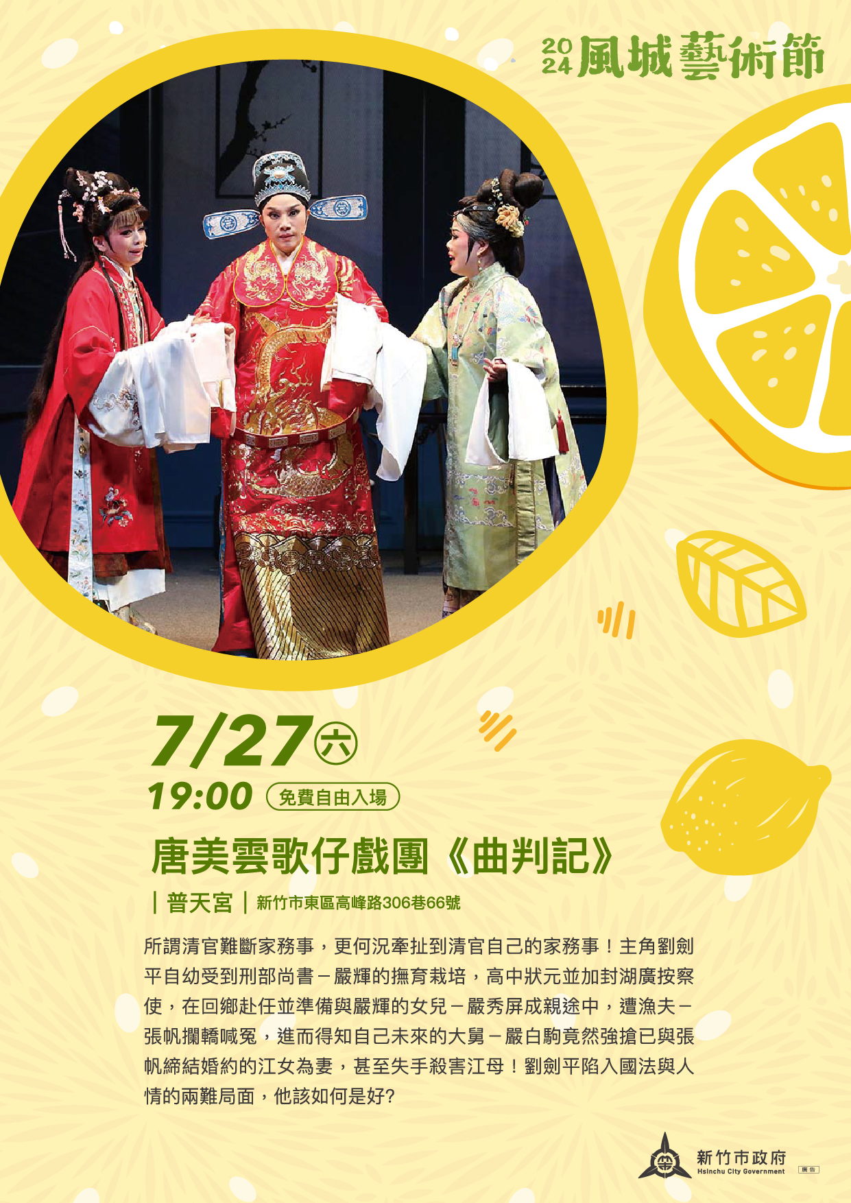 📌7/27(六)19:00,東區/普天宮,唐美雲歌仔戲團《曲判記》