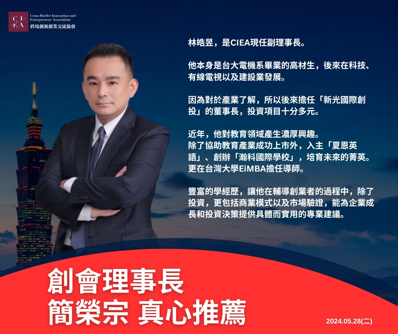 - 林皓昱,是CIEA現任副理事長。他本身是台大電機系畢業的高材生,後來在科技、有線電視以及建設業發展。因為對於產業了解,所以後來擔任「新光國際創投」的董事長,投資項目十分多元。