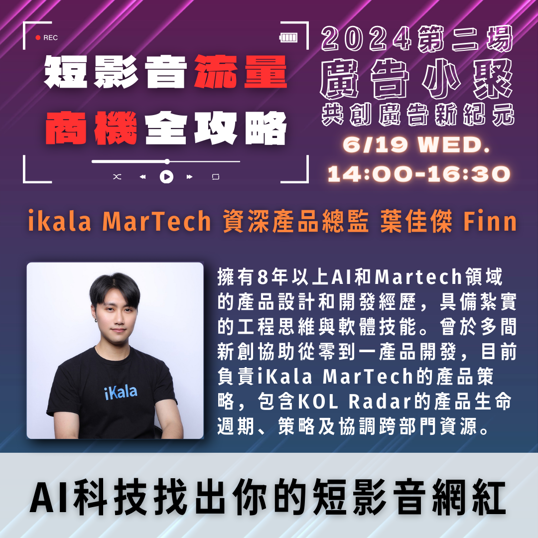 | 15:45-16:00 | AI 科技找出你的短影音網紅 | iKala MarTech 資深產品總監 葉佳傑 Finn Yeh |