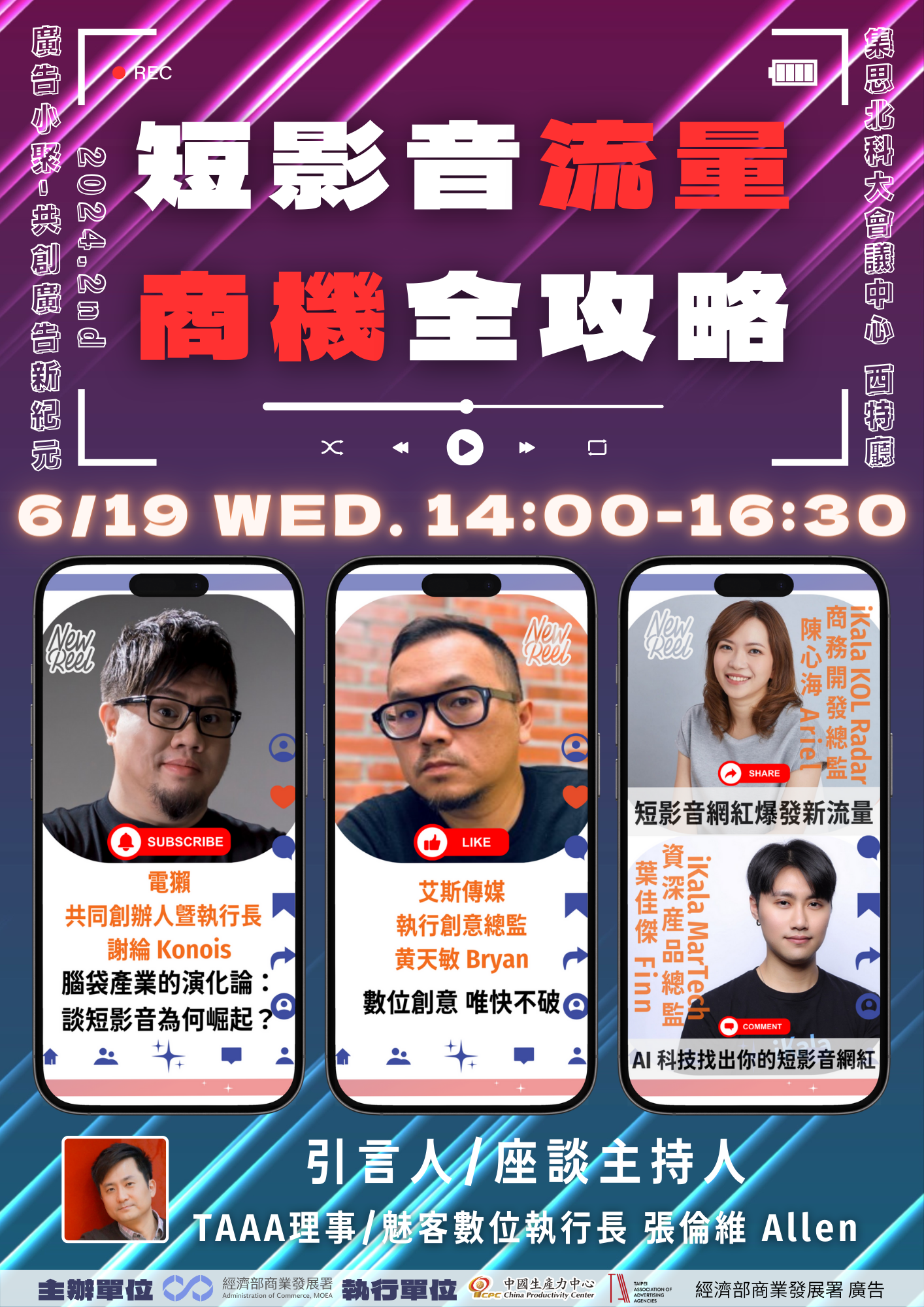 16:00-16:30 | 座談Q&A | 主持人: TAAA 理事 / 魅客數位執行長 張倫維 Allen Chang 與談人: 電獺共同創辦人暨執行長 謝綸 Konois Xie 艾斯傳媒 執行創意總監 黃天敏 Bryan Huang iKala KOL Radar 商務開發總監 陳心海 Ariel Chen iKala MarTech 資深產品總監 葉佳傑 Finn Yeh |