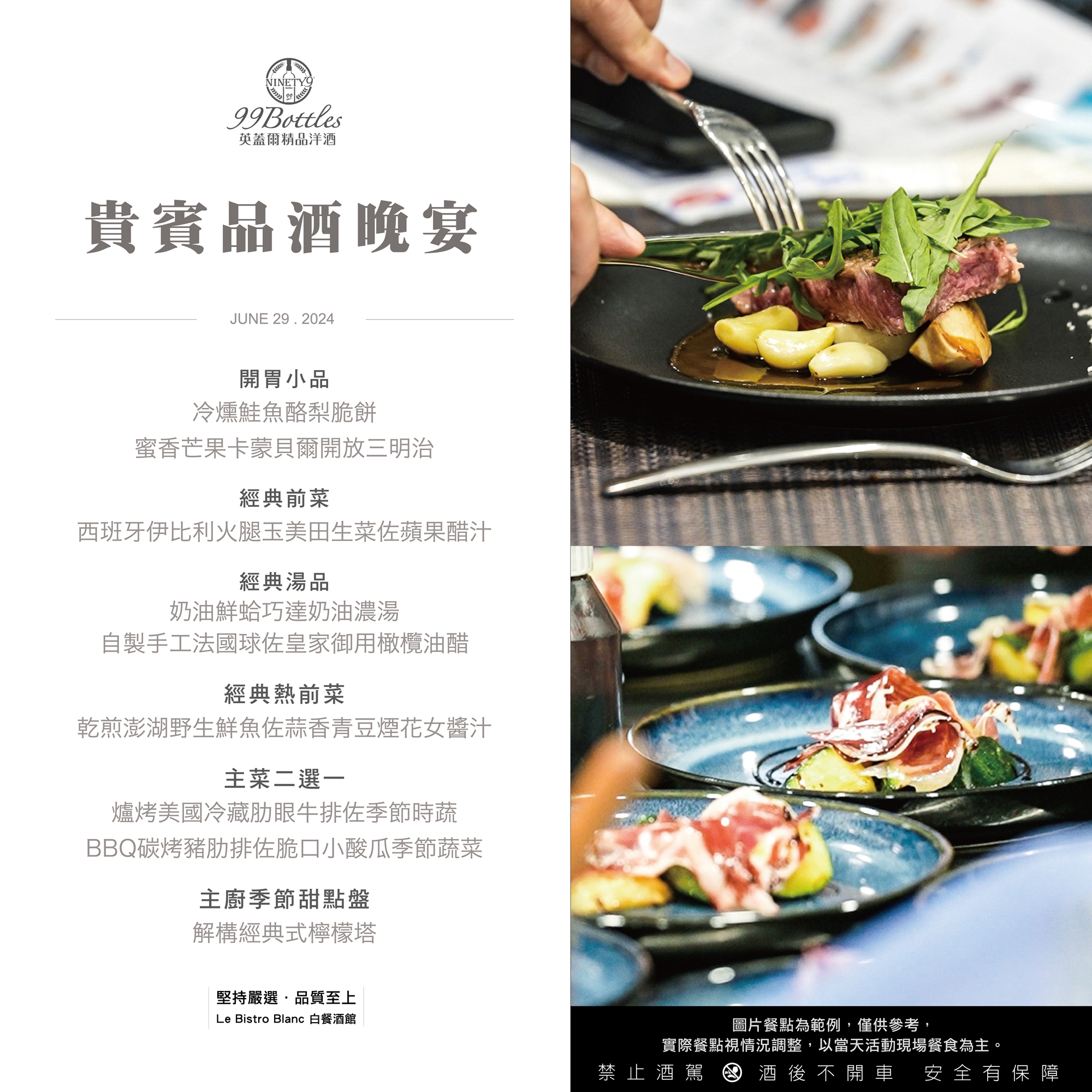 此外,美食更是能與好酒相得益彰,特邀台中人氣餐酒館「Le Bistro Blanc 高帽鄉廚 白 餐酒館」依照酒單設計搭配,絕對能夠滿足您的味蕾,為您帶來非凡的品酒體驗!