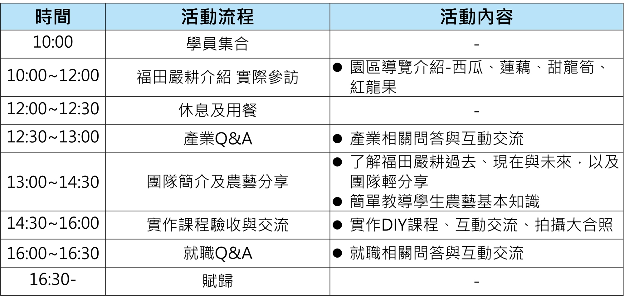 農藝知識分享與種植體驗,由福田嚴耕有機農場的場主親自帶著大家體驗農耕生活,「下田」、「採果」、「種植」等DIY農趣生活。堅持「厚植福田,嚴耕慎作」的態度,教導學生農藝基本知識,生產安心特色農產,讓年輕人從都市走向農田,感受大自然的美好。