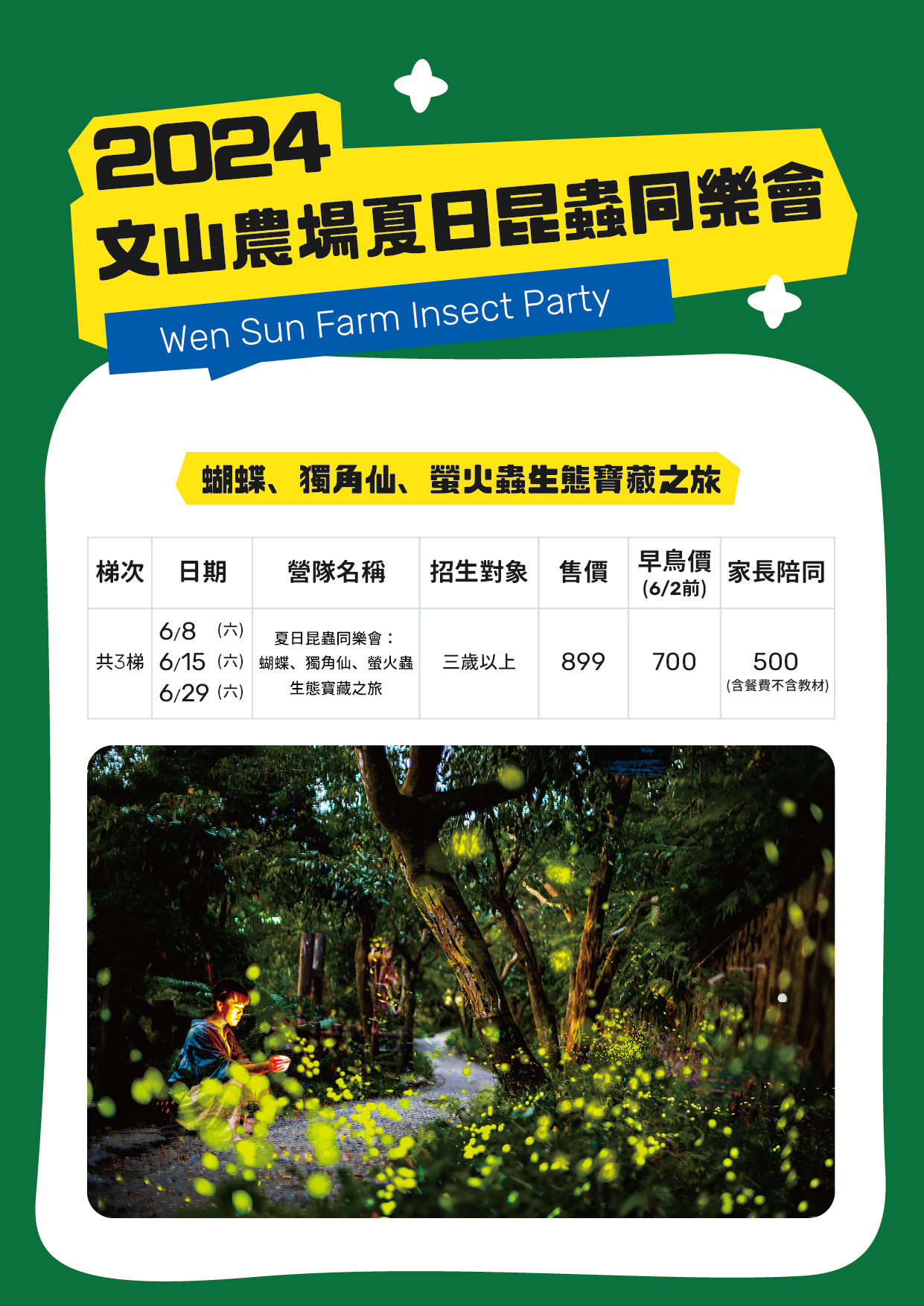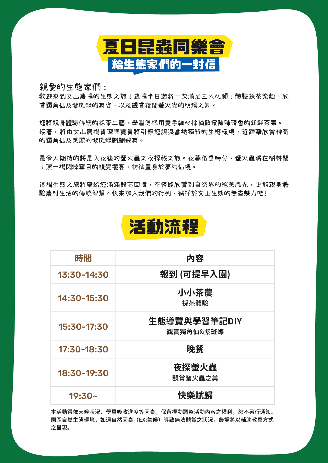 賞獨角仙及紫斑蝶的舞姿,以及觀賞夜間螢火蟲的明燭之舞。
