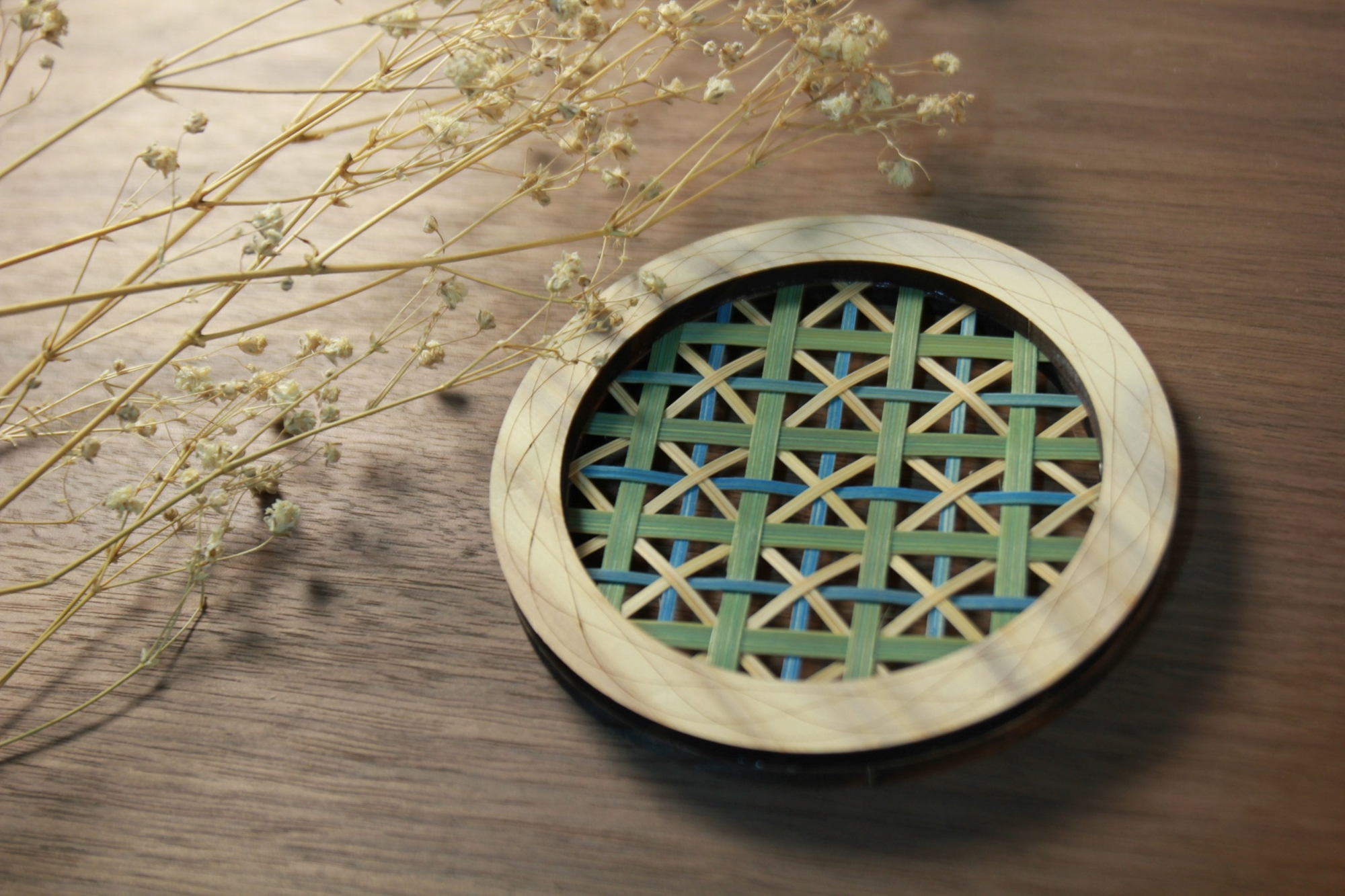 以傳統竹編技法編織成鏤空星芒圖樣,可放置茶杯,亦可作為點心盤。 嚴選國產材臺灣竹、臺灣杉(外框部分)等在地材料、自然媒材,品味生活的同時,不為地球帶來負擔。