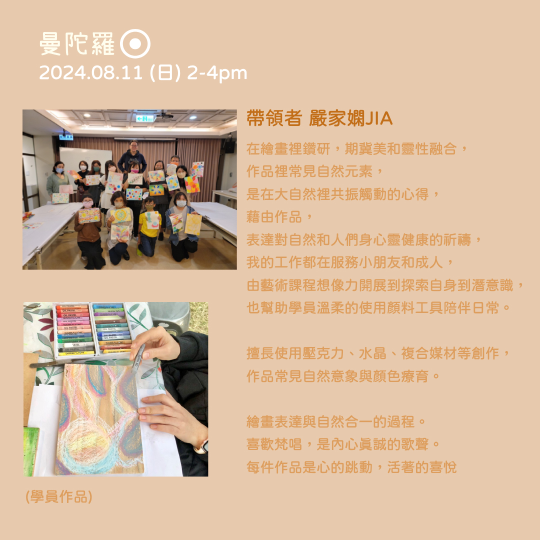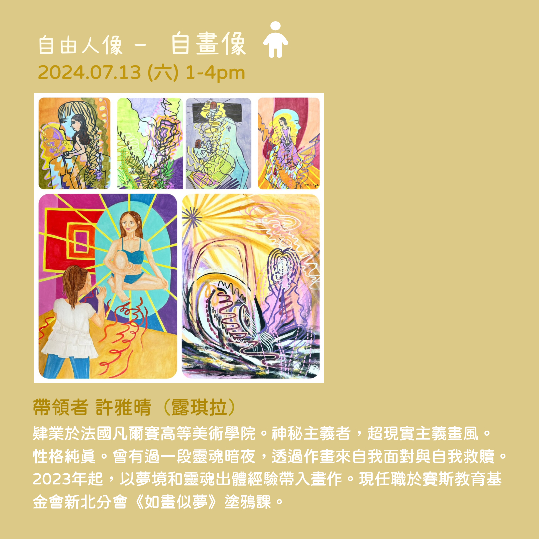 透過自畫像、自性的圓(曼陀羅)、聆聽與朗誦環境(他人與我的呼應)、潛意識牌卡,探索自我的不同面向。