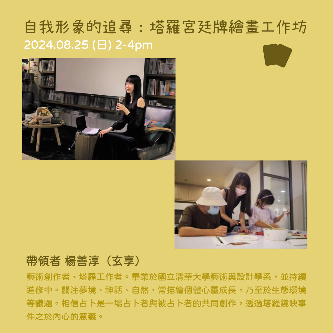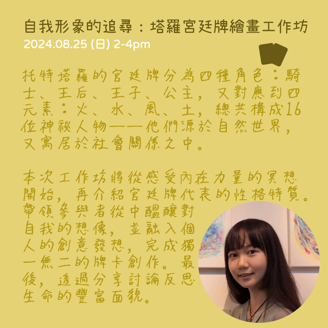 本次工作坊將從感受內在力量的冥想開始,再介紹宮廷牌代表的性格特質。帶領參與者從中醞釀對自我的想像,並融入個人的創意發想,完成獨一無二的牌卡創作。最後,透過分享討論反思生命的豐富面貌。