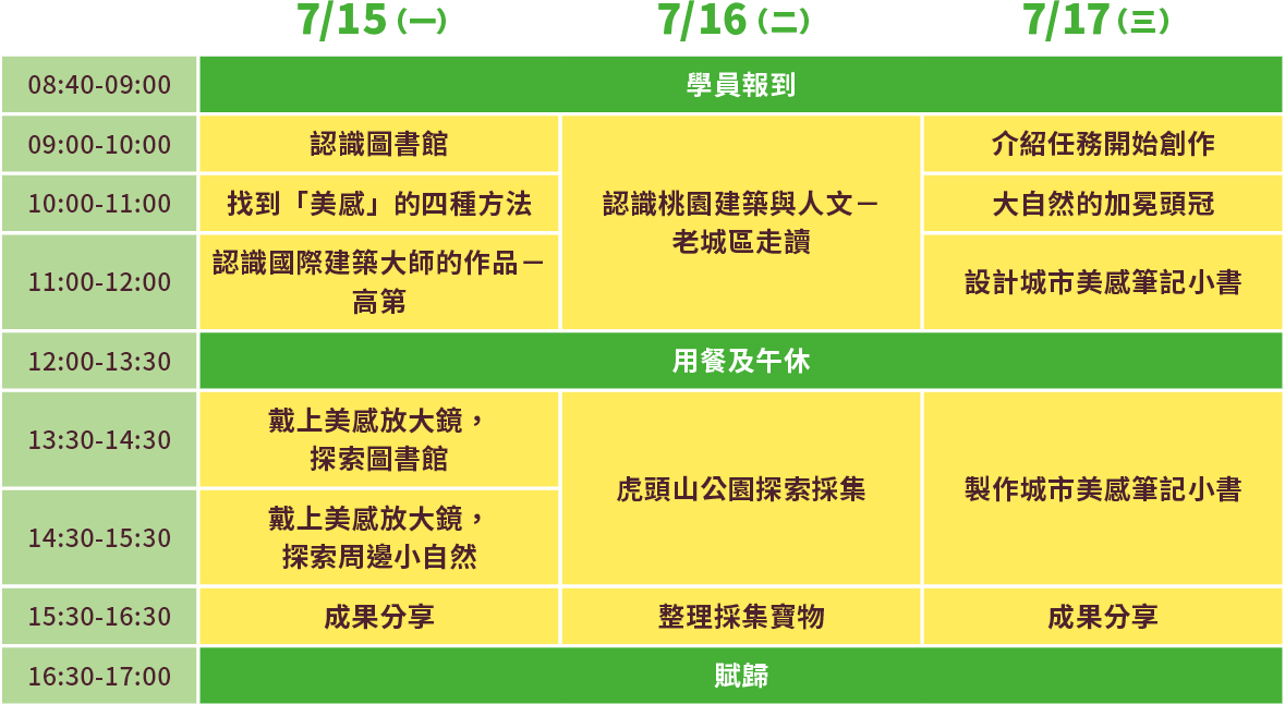 日期:7/15(一)-7/17(三) 09:00-16:30,包含午休1.5小時