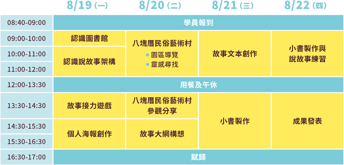 日期:8/19(一)-8/22(四) 09:00-16:30,包含午休1.5小時